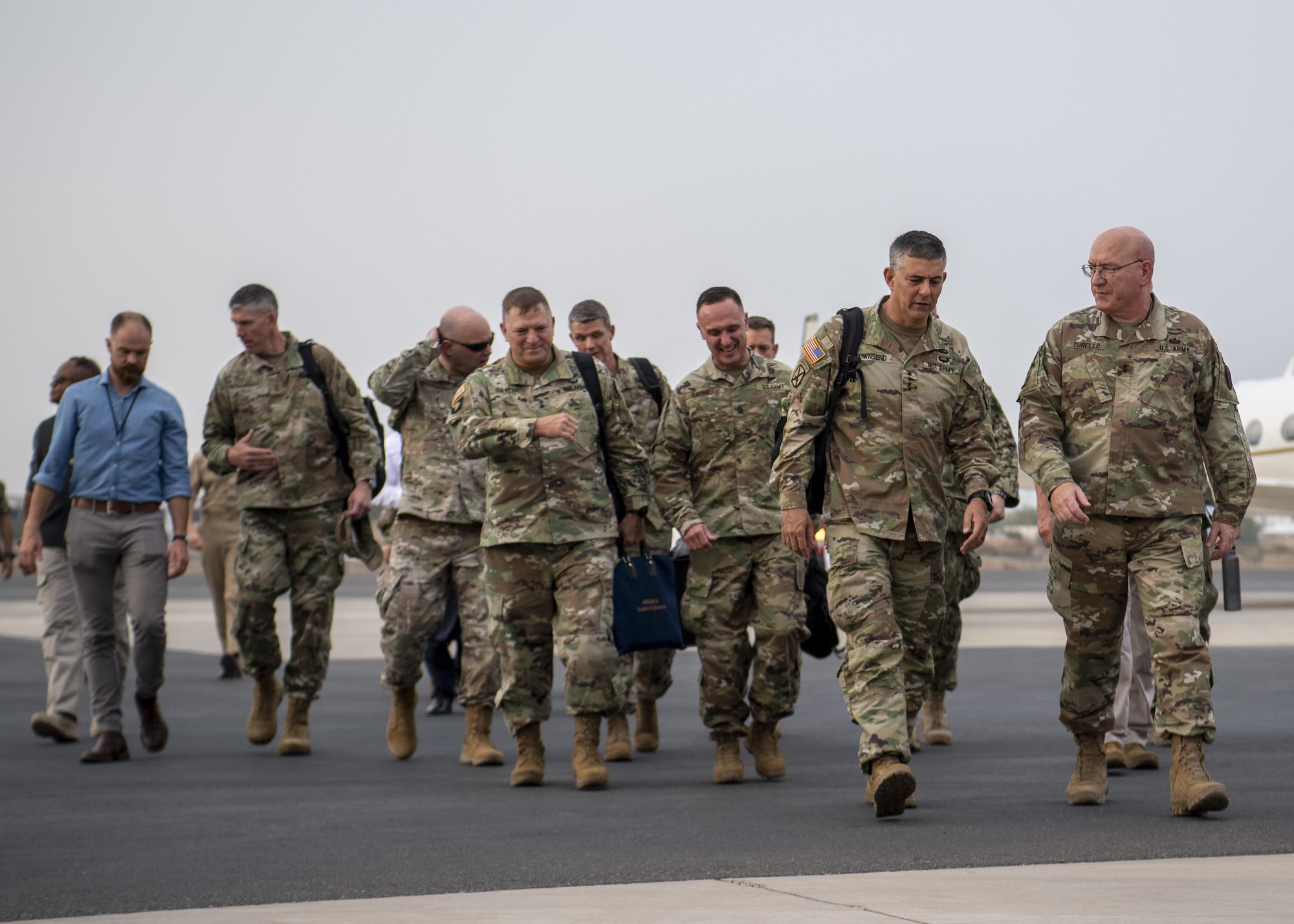 U.S. Army Gen. Stephen J. Townsend, commander, U.S. Africa Command (AFRICOM), left, is escorted while touring Camp Lemonnier by U.S. Army Maj. Gen. Michael Turello, commanding general, Combined Joint Task Force-Horn of Africa (CJTF-HOA), at Camp Lemonnier, Djibouti, August 5, 2019. As commander of AFRICOM Townsend is in charge of military relations with African nations, the African Union and African regional security organizations. Townsend visited Djibouti as part of his familiarization of CJTF-HOA. (U.S. Air Force photo by Staff Sgt. J.D. Strong II)