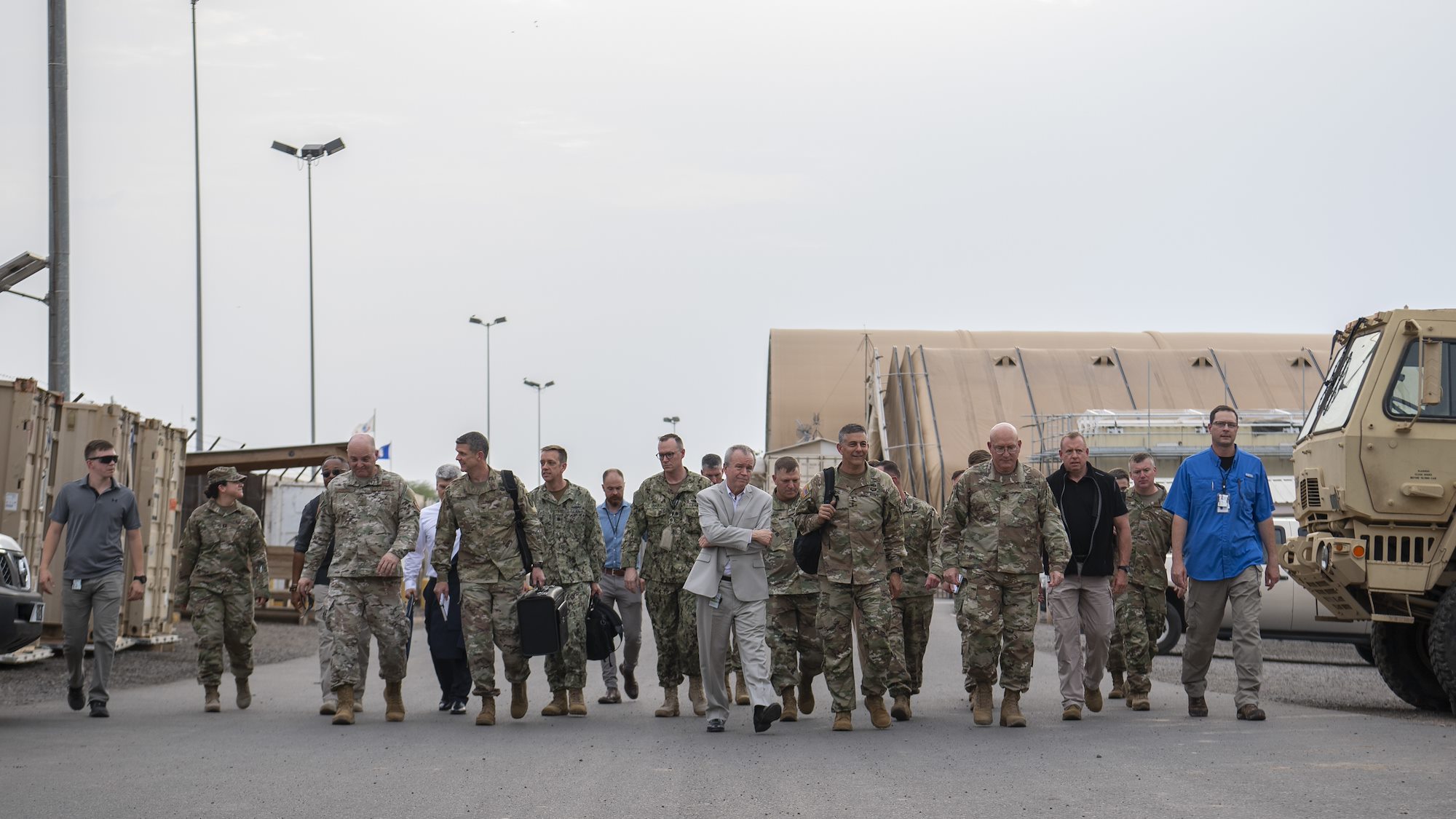 U.S. Army Gen. Stephen J. Townsend, commander, U.S. Africa Command (AFRICOM), center-right, is escorted while touring Camp Lemonnier by U.S. Army Maj. Gen. Michael Turello, commanding general, Combined Joint Task Force-Horn of Africa (CJTF-HOA), and U.S. Ambassador to Djibouti, Larry E. André at Camp Lemonnier, Djibouti, August 5, 2019. As commander of AFRICOM Townsend is in charge of military relations with African nations, the African Union and African regional security organizations. Townsend visited Djibouti as part of his familiarization of CJTF-HOA. (U.S. Air Force photo by Staff Sgt. J.D. Strong II)