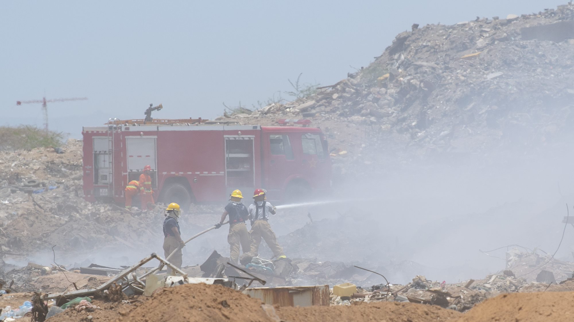 Camp Lemonnier Fire and Emergency Services firefighters use a hose to extinguish a fire alongside Chinese firefighters at Douda landfill in Djibouti, Aug. 14, 2019. At the request of the government of Djibouti and in support of the U.S. Embassy Djibouti, Combined Joint Task Force-Horn of Africa engineers worked alongside Camp Lemonnier, Djiboutian, French and Chinese firefighters to help stop a fire at the landfill from spreading. (U.S. Air Force photo by Staff Sgt. J.D. Strong II)