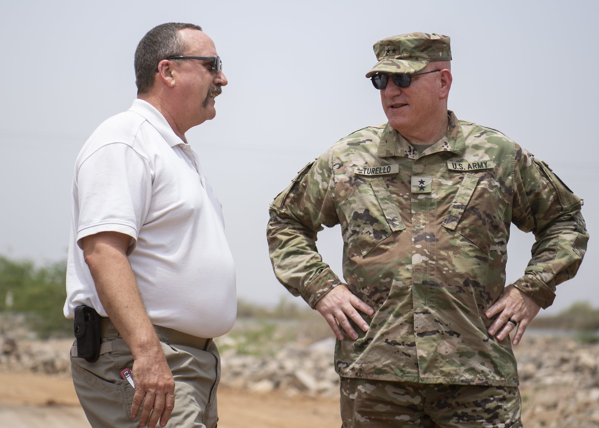 U.S. Army Maj. Gen. Michael Turello, commanding general, Combined Joint Task Force-Horn of Africa (CJTF-HOA), right, speaks with Stephen Skola, deputy fire chief, Camp Lemonnier Fire and Emergency Services, about the firefighting efforts at Douda landfill in Djibouti, Aug. 14, 2019. At the request of the government of Djibouti and in support of the U.S. Embassy Djibouti, CJTF-HOA engineers worked alongside Camp Lemonnier, Djiboutian, French and Chinese firefighters to help stop a fire at the landfill from spreading. (U.S. Air Force photo by Staff Sgt. J.D. Strong II)