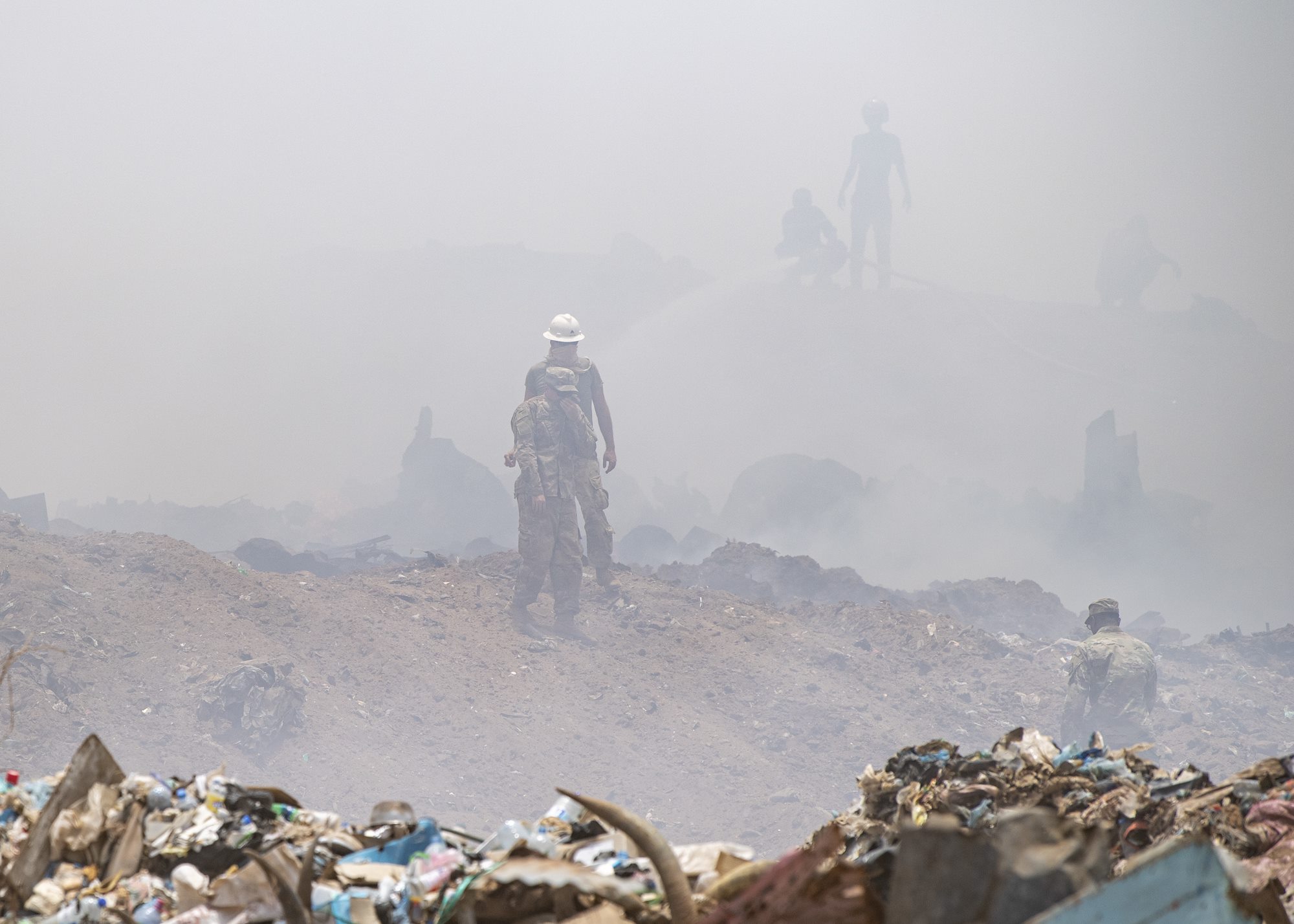 A Djiboutian Fire Brigade firefighter traverses the Douda landfill in Djibouti, Aug. 14, 2019. At the request of the government of Djibouti and in support of the U.S. Embassy Djibouti, Combined Joint Task Force-Horn of Africa engineers worked alongside Camp Lemonnier, Djiboutian, French and Chinese firefighters to help stop a fire at the landfill from spreading. (U.S. Air Force photo by Staff Sgt. J.D. Strong II)