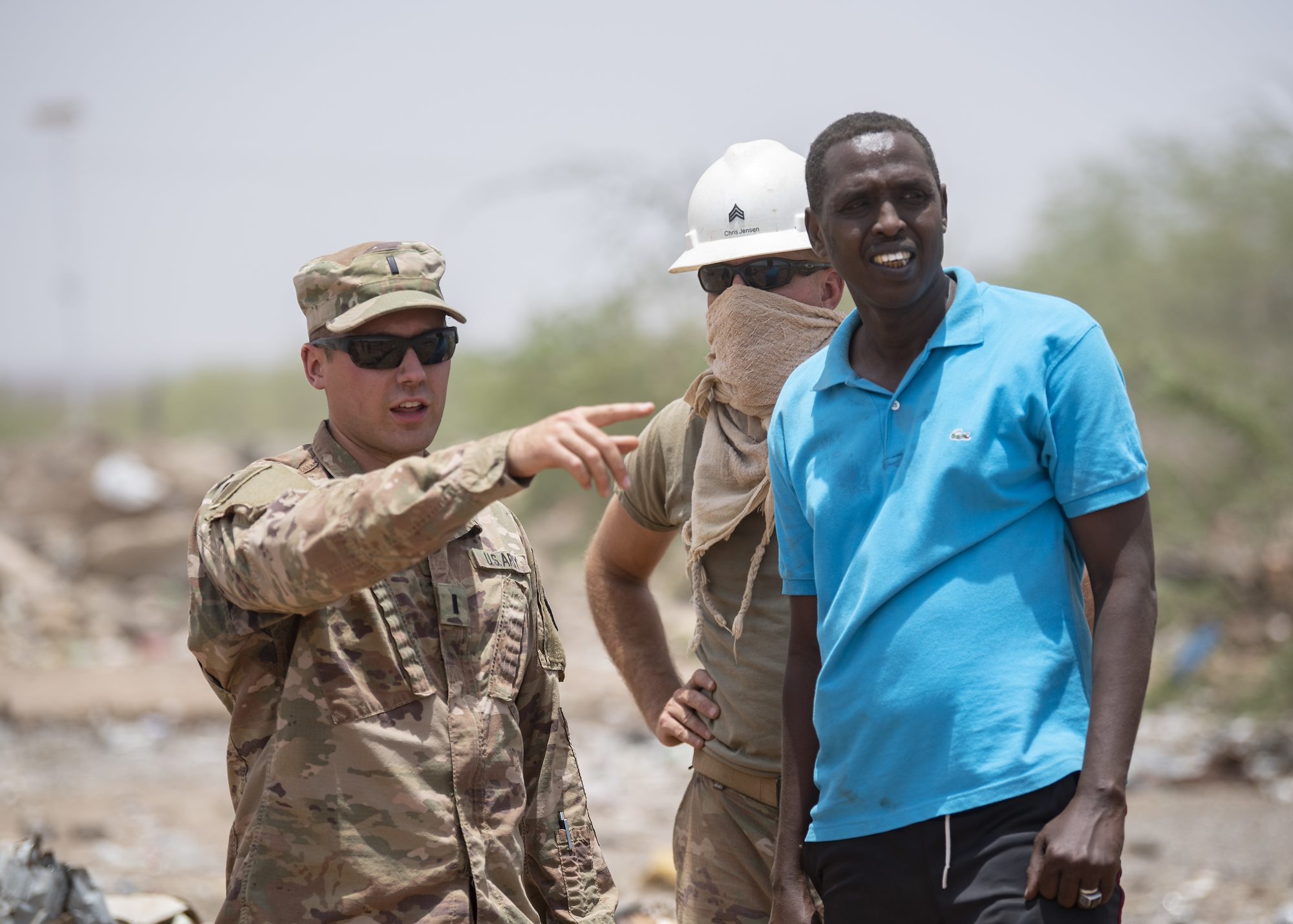 U.S. Army 1st Lt. Daniel Csakai, platoon leader, 465th Engineer Company, 926th Engineer Battalion, 926th Engineer Brigade, 412th Theater Engineer Command, based in Birmingham, Alabama, assigned to Combined Joint Task Force-Horn of Africa, speaks with a Djibouti Fire Brigade firefighter about the firefighting efforts at Douda landfill in Djibouti, Aug. 14, 2019. During a fire at the landfill, the 465th used bulldozers to create dirt berms that would make firebreaks and stop the flames from spreading outward. (U.S. Air Force photo by Staff Sgt. J.D. Strong II)