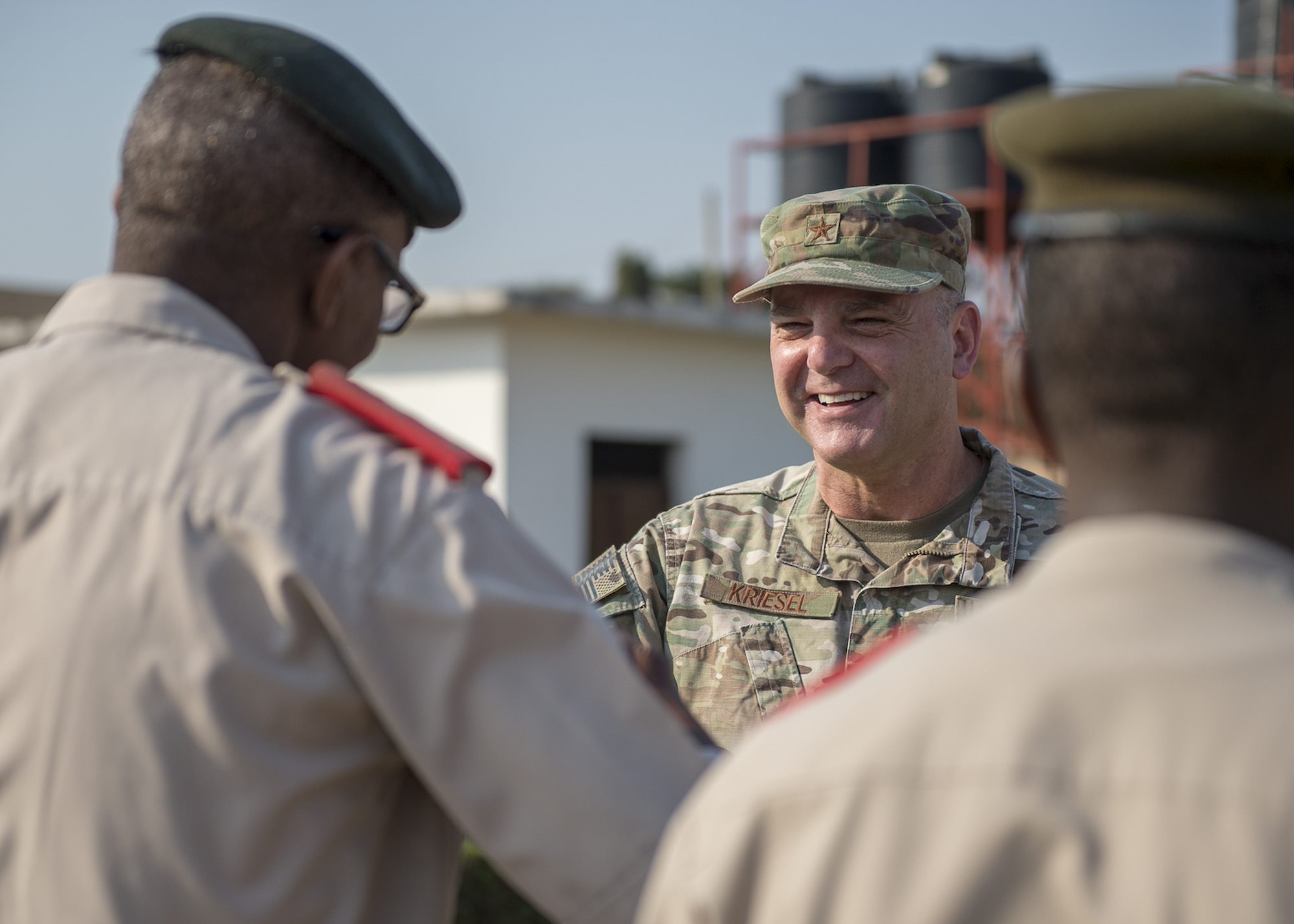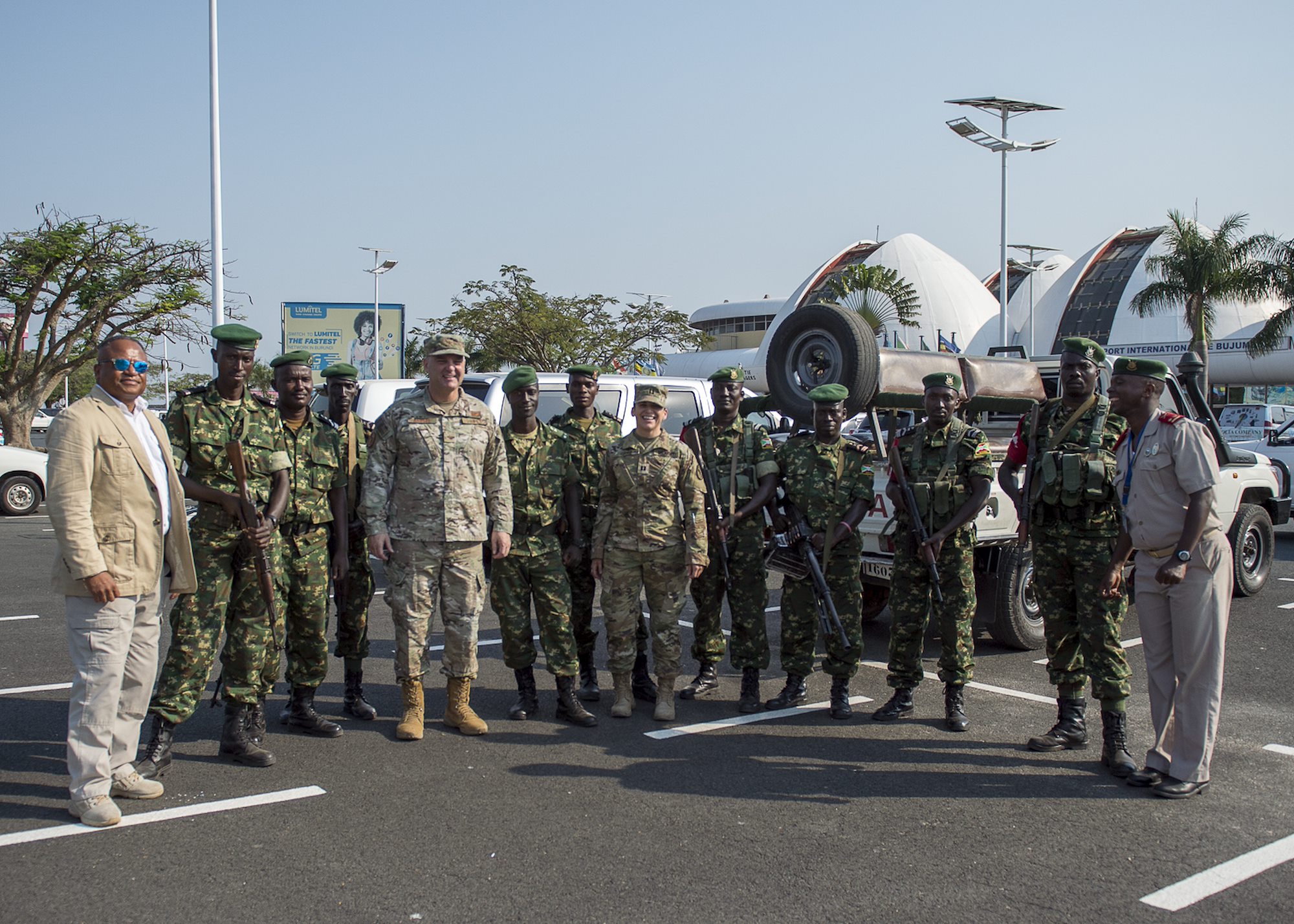 U.S. Air Force Brig. Gen. James R. Kriesel, deputy commanding general of Combined Joint Task Force-Horn of Africa, poses with soldiers from the Burundi National Defence Force (BNDF) in Bujumbura, Burundi, July 18, 2019. The BNDF is the Burundi’s military force with more than 20,000 personnel. (U.S. Air Force Photo by Senior Airman Codie Trimble)