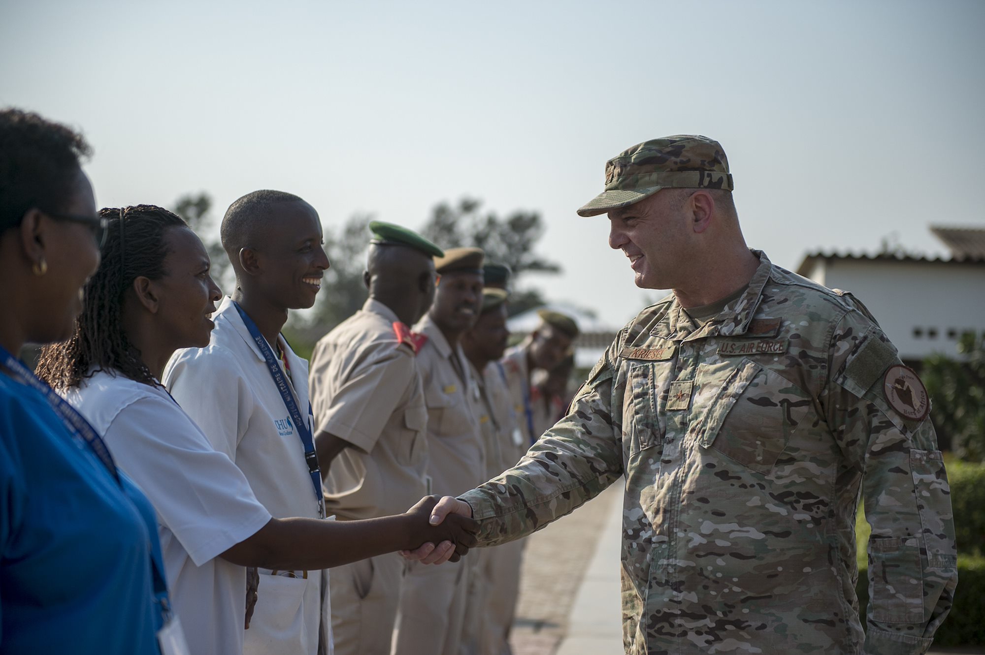 U.S. Air Force Brig. Gen. James R. Kriesel, deputy commanding general of Combined Joint Task Force-Horn of Africa, greets Burundi National Defence Force Lt. Gen. Prime Niyongabo, BNDF chief of defence, at the BNDF Senior Command and Staff College (SCSC) in Bujumbura, Burundi, July 19, 2019. The mission of the Burundi SCSC is to develop professional knowledge, skills in leadership, art and science of war to senior officers to enhance their capabilities in both command and staff duties at formation level and above. (U.S. Air Force Photo by Senior Airman Codie Trimble)