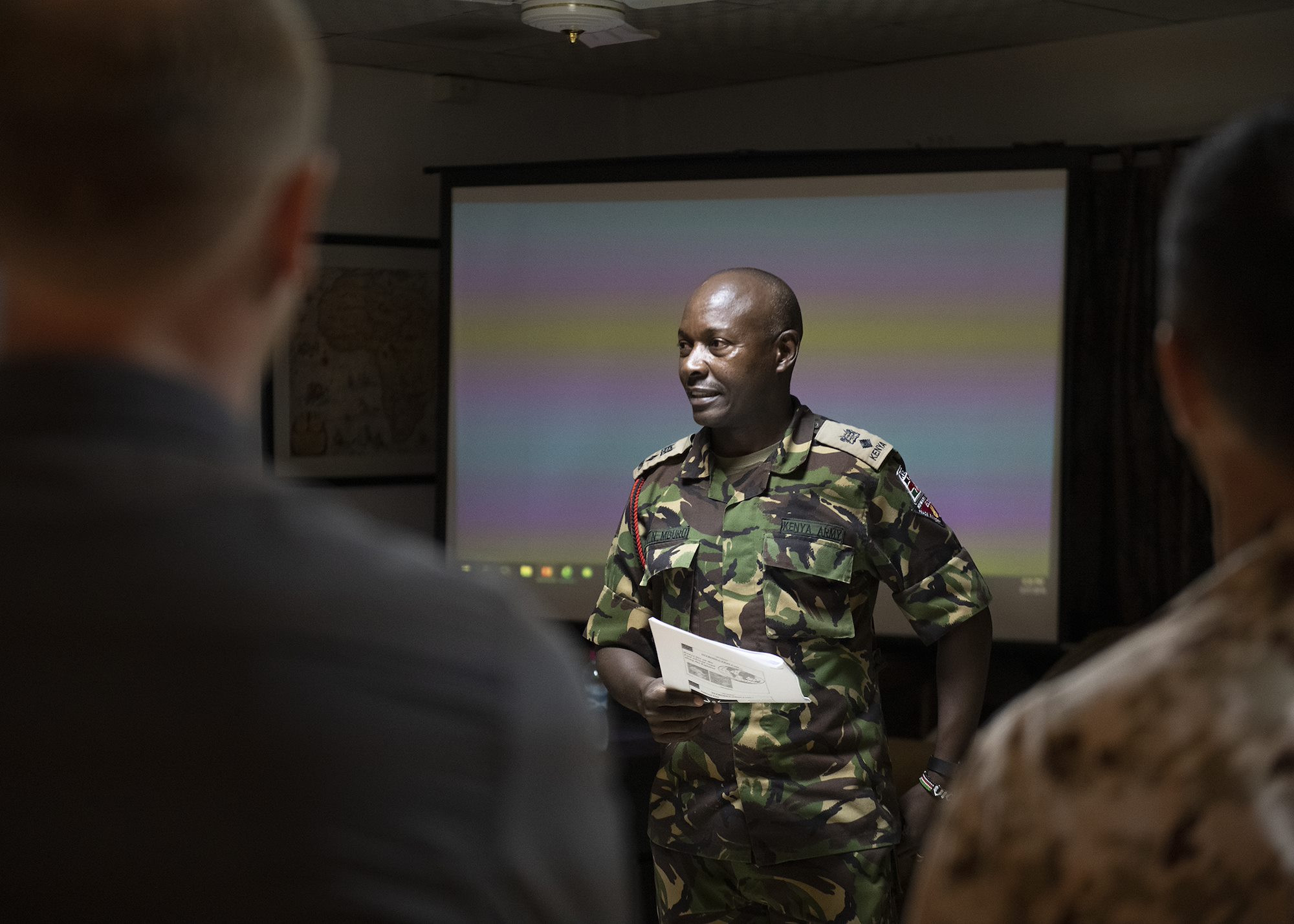 Kenya Defence Force Lt. Col. Victor Mburu, a foreign liaison officer assigned to Combined Joint Task Force-Horn of Africa (CJTF-HOA), presents information on his home country to multinational military partners during a cultural exchange event at Camp Lemonnier, Djibouti, March 27, 2019. CJTF-HOA holds monthly exchange events with multinational military partners affiliated with Camp Lemonnier to strengthen alliances and attract new partners in the combined joint military environment. (U.S. Air Force photo by Tech. Sgt. Shawn Nickel)