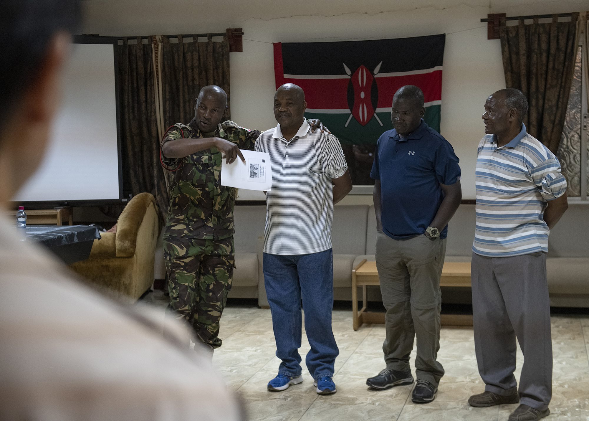Kenya Defence Force Lt. Col. Victor Mburu, a foreign liaison officer assigned to Combined Joint Task Force-Horn of Africa (CJTF-HOA), introduces fellow countrymen who work on Camp Lemonnier, Djibouti, to multinational military partners while presenting information on his home country during a cultural exchange event at Camp Lemonnier, March 27, 2019. CJTF-HOA holds monthly exchange events with multinational military partners affiliated with Camp Lemonnier to strengthen alliances and attract new partners in the combined joint military environment. (U.S. Air Force photo by Tech. Sgt. Shawn Nickel)