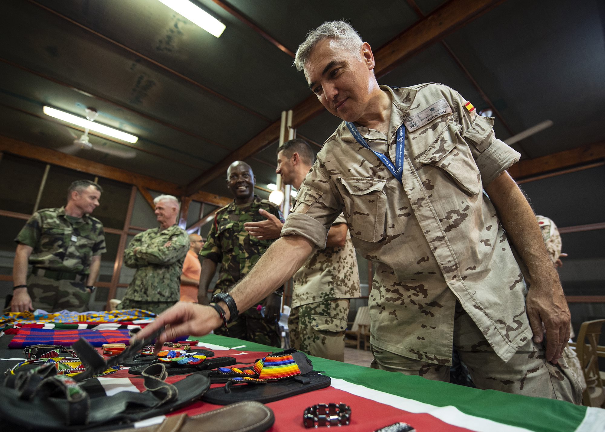 Multinational military partners look at memorabilia from Kenya while attending a Combined Joint Task Force-Horn of Africa (CJTF-HOA) cultural exchange event at Camp Lemonnier, Djibouti, March 27, 2019. CJTF-HOA holds monthly exchange events with multinational military partners affiliated with Camp Lemonnier to strengthen alliances and attract new partners in the combined joint military environment. (U.S. Air Force photo by Tech. Sgt. Shawn Nickel)