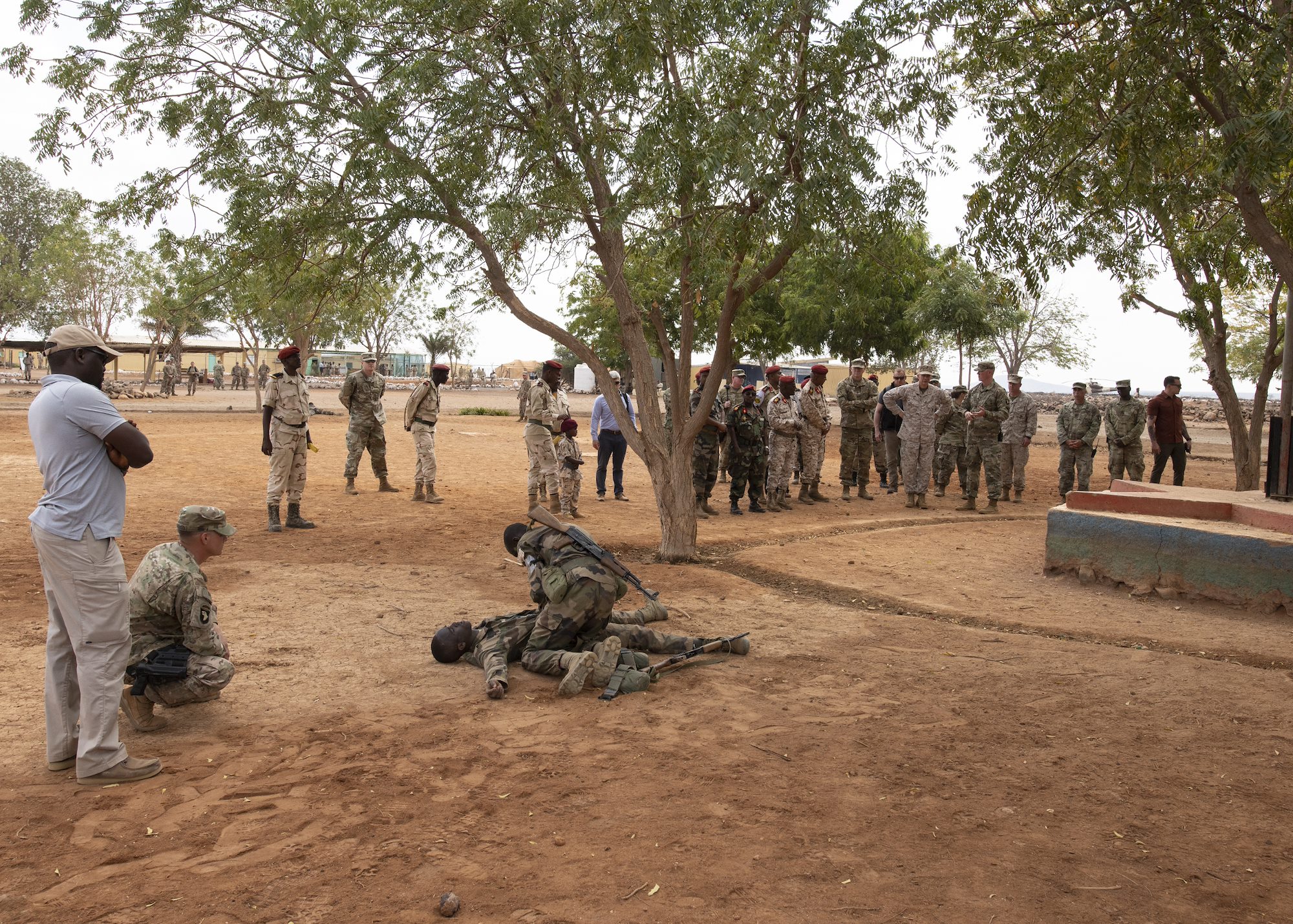 U.S. Marine Corps Gen. Thomas D. Waldhauser, commander of U.S. Africa Command, watches a demonstration by a soldier assigned to the Rapid Intervention Battalion, the Djiboutian army’s elite military force, during a visit with senior Djiboutian officials, including Chief of General Staff of the Djibouti Armed Forces Gen. Zakaria Cheik Ibrahim, at a training base in Djibouti, March 21, 2019. Waldhauser visited in order to discuss the growth and development of Djiboutian security forces. (U.S. Air Force photo by Tech. Sgt. Shawn Nickel)