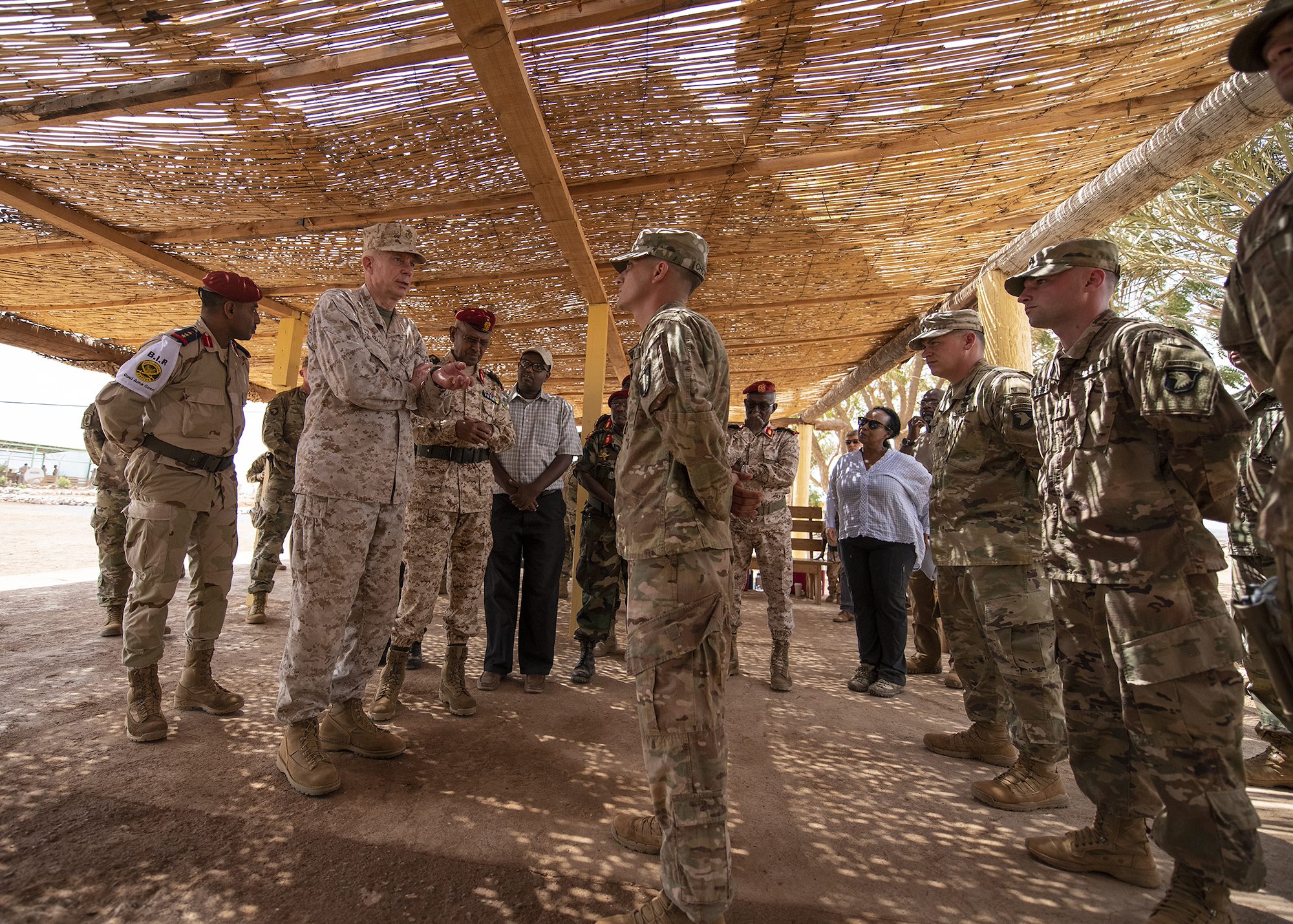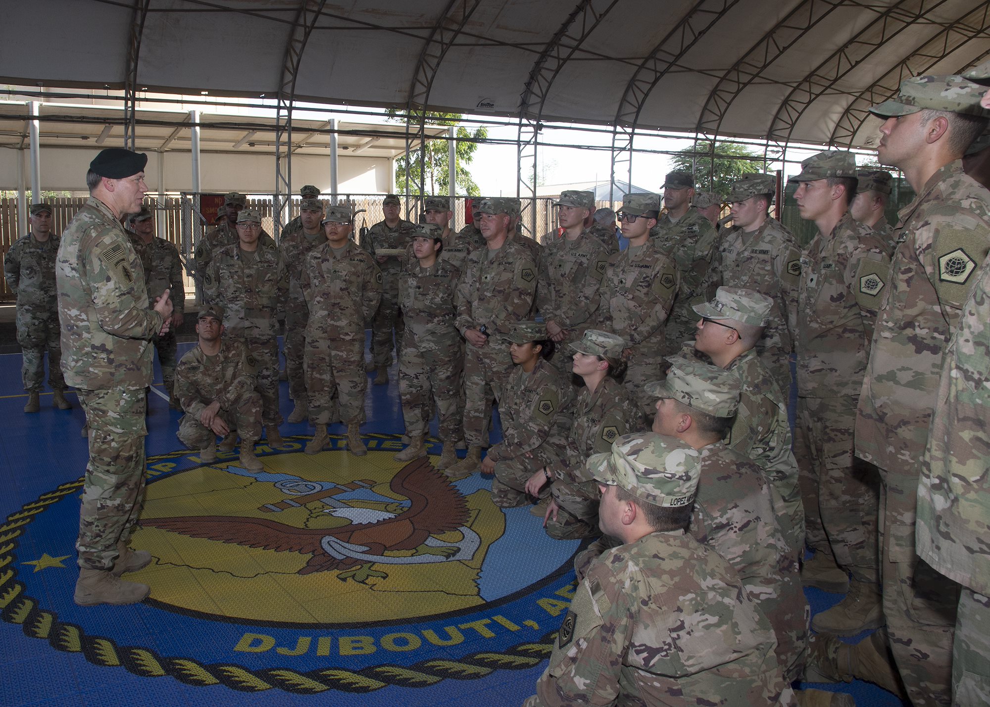 U.S. Marine Corps Gen. Thomas D. Waldhauser, left center, commander of U.S. Africa Command, addresses U.S. Army Soldiers fromHeadquarters Company, 1-26 Infantry Battalion, 2nd Brigade Combat Team, 101st Airborne, assigned to Combined Joint Task Force-Horn of Africa, who train Rapid Intervention Battalion (RIB) soldiers during his visit with senior Djiboutian officials, including Chief of General Staff of the Djibouti Armed Forces Zakaria Cheik Ibrahim, at a training base in Djibouti, March 21, 2019. While in Djibouti, Waldhauser observed the ongoing growth and development of the RIB, the Djiboutian army’s elite military force, which the U.S. is in the process of training and equipping at the request of the Djiboutian government. (U.S. Air Force photo by Tech. Sgt. Shawn Nickel)