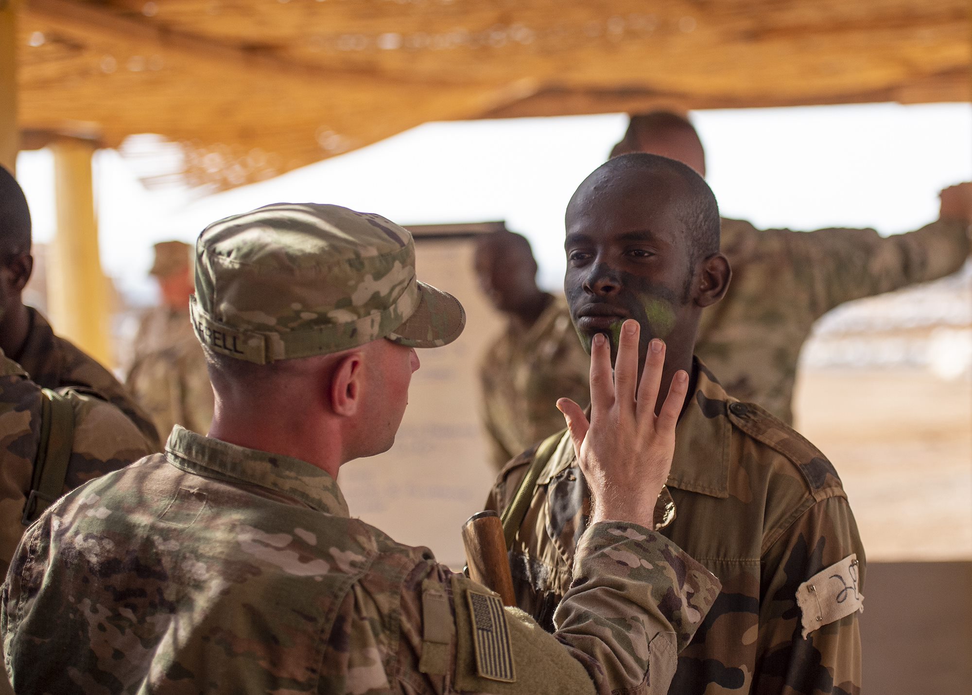 A U.S. Army Soldier with Headquarters Company, 1-26 Infantry Battalion, 2nd Brigade Combat Team, 101st Airborne, assigned to Combined Joint Task Force-Horn of Africa, helps a soldier from the Rapid Intervention Battalion (RIB), the Djiboutian army’s elite military force, prepare for a visit from U.S. Marine Corps Gen. Thomas D. Waldhauser, commander of U.S. Africa Command, and Chief of General Staff of the Djibouti Armed Forces Zakaria Cheik Ibrahim, at a training base in Djibouti, March 21, 2019. Waldhauser and Zakaria visited in order to discuss the growth and development of Djiboutian security forces. (U.S. Air Force photo by Tech. Sgt. Shawn Nickel)