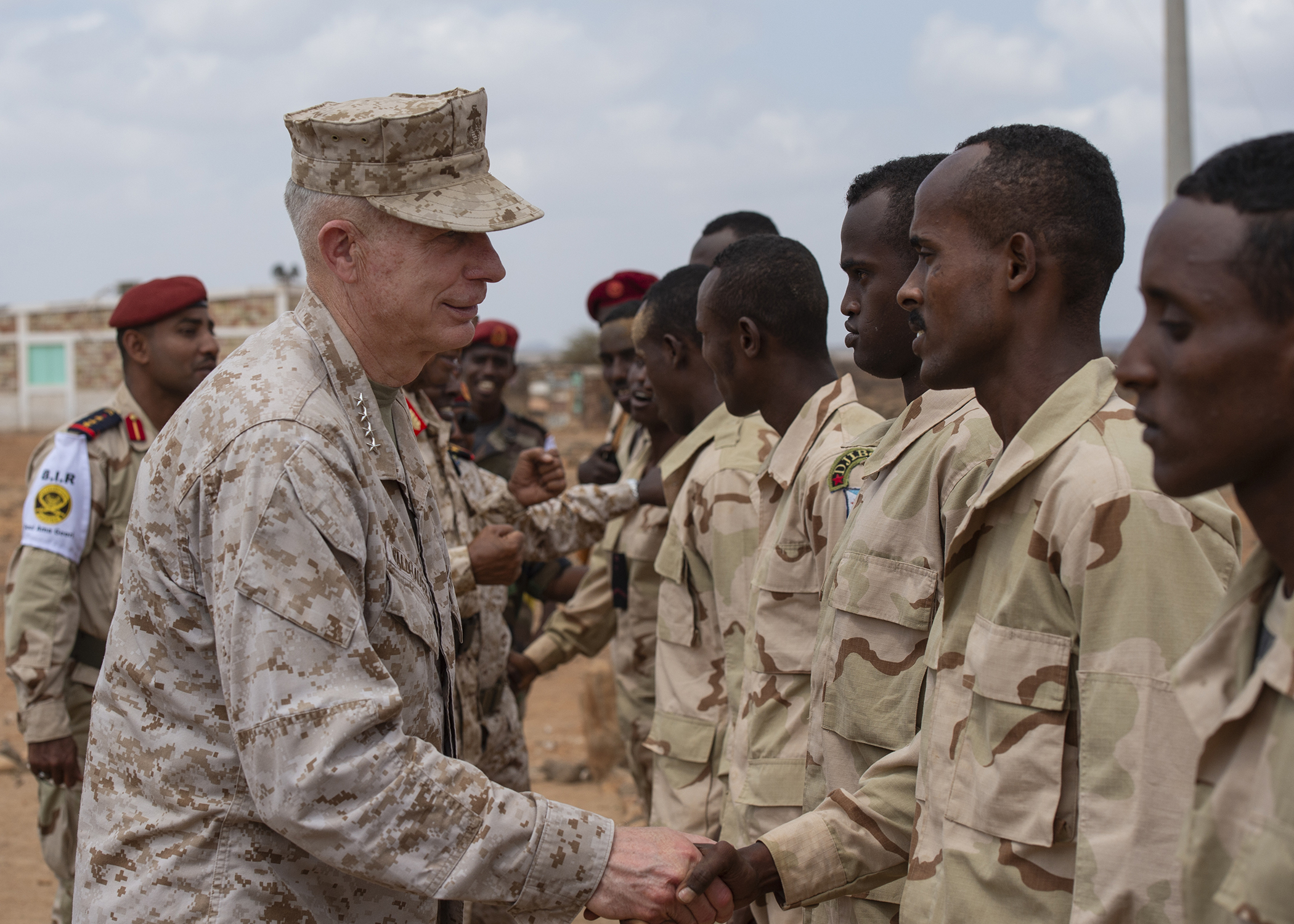 U.S. Marine Corps Gen. Thomas D. Waldhauser, commander of U.S. Africa Command, speaks to soldiers from the Djiboutian army’s elite military force, the Rapid Intervention Battalion, after a tactical demonstration during a visit with senior Djiboutian officials, including Chief of General Staff of the Djibouti Armed Forces Zakaria Cheik Ibrahim, at a training base in Djibouti, March 21, 2019. Waldhauser visited in order to discuss the growth and development of Djiboutian security forces. (U.S. Air Force photo by Tech. Sgt. Shawn Nickel)