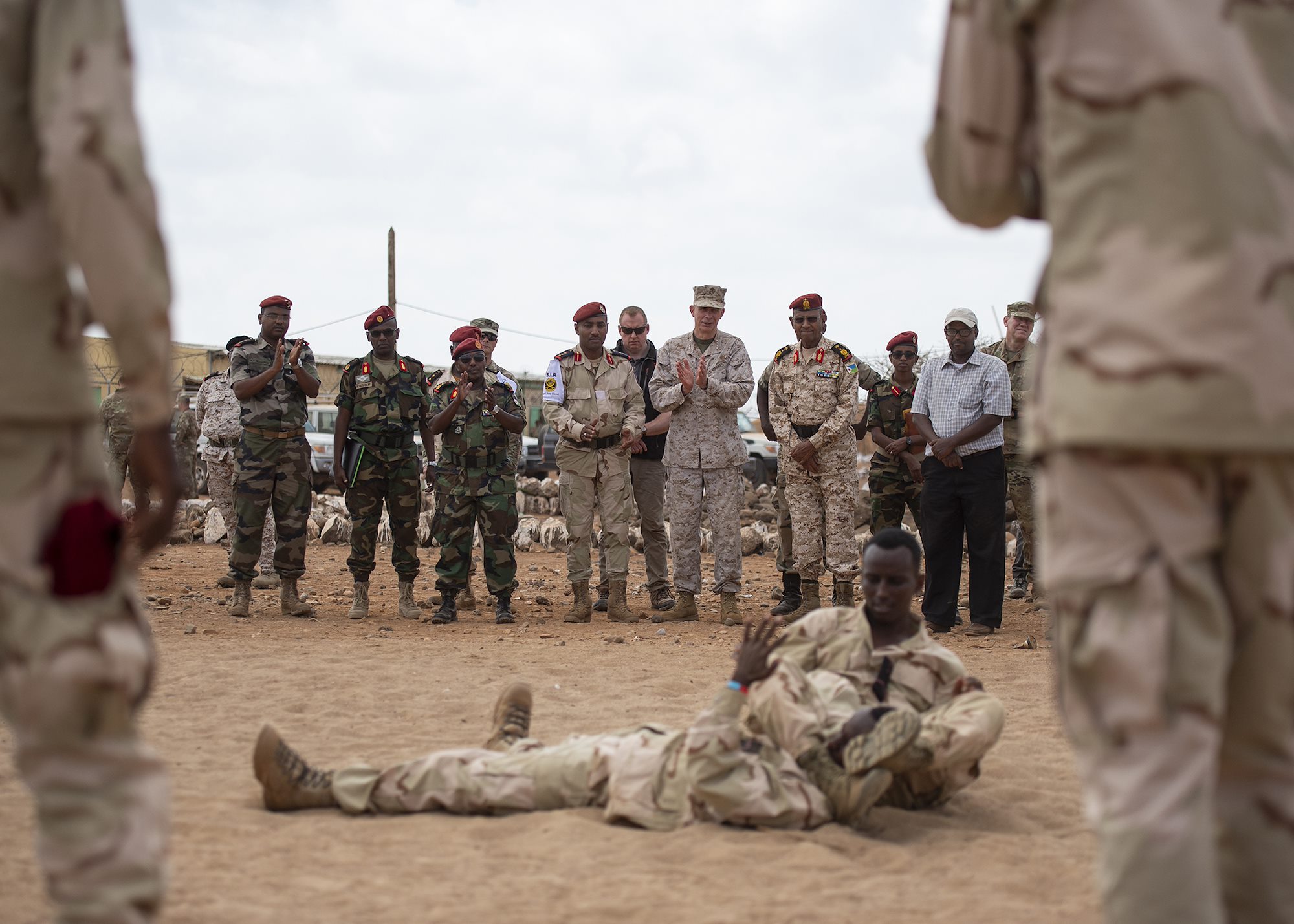 U.S. Marine Corps Gen. Thomas D. Waldhauser, commander of U.S. Africa Command, watches a demonstration by soldiers assigned to the Rapid Intervention Battalion, the Djiboutian army’s elite military force, during a visit with senior Djiboutian officials, including Chief of General Staff of the Djibouti Armed Forces Zakaria Cheik Ibrahim, at a training base in Djibouti, March 21, 2019. Waldhauser visited in order to discuss the growth and development of Djiboutian security forces. (U.S. Air Force photo by Tech. Sgt. Shawn Nickel)