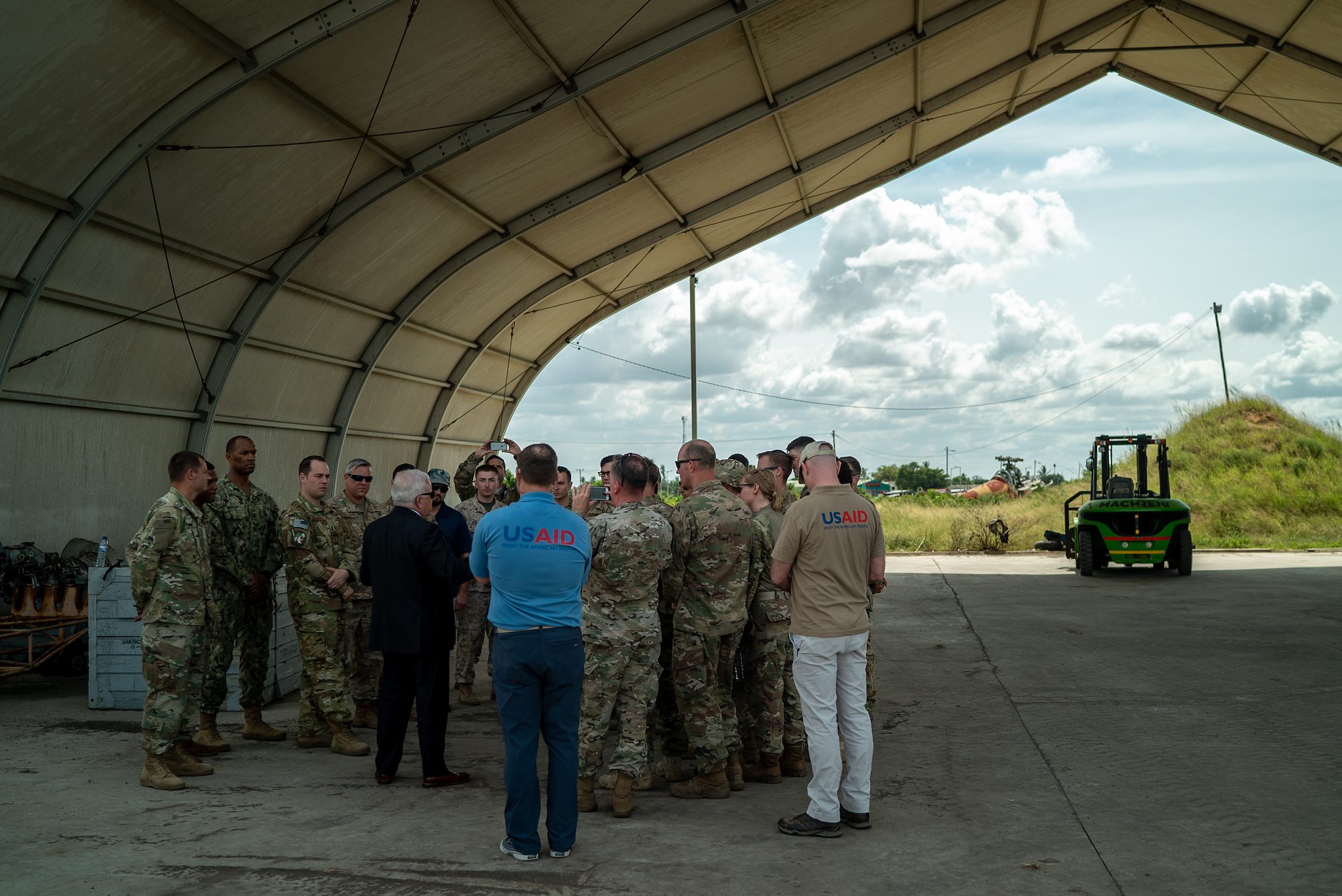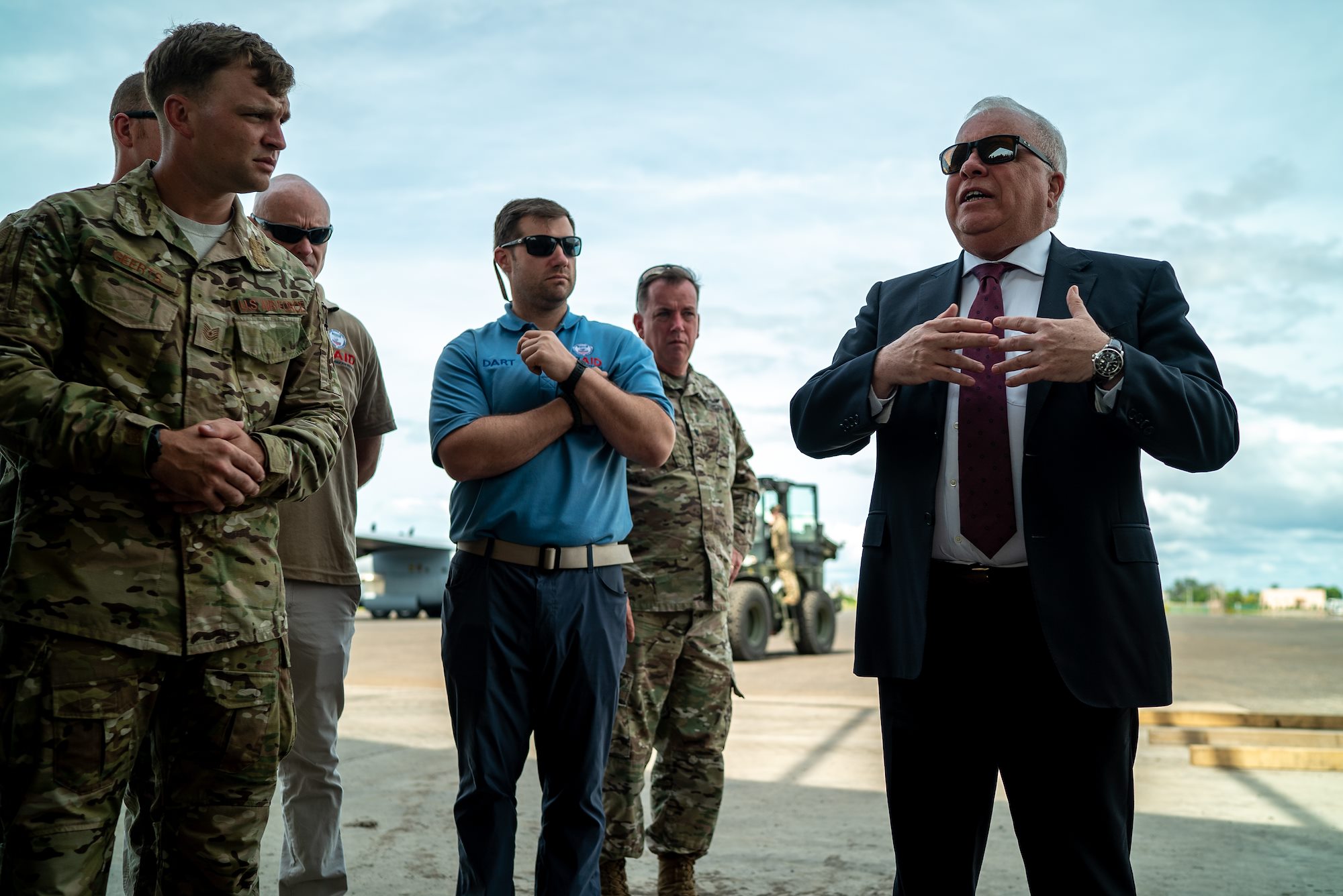 Dennis Walter Hearne, U.S. Ambassador to the Republic of Mozambique, meets with U.S. service members assigned to Combined Joint Task Force-Horn of Africa (CJTF-HOA) in Maputo, Mozambique, April 11, 2019. CJTF-HOA led U.S. Department of Defense Cyclone Idai relief efforts in support of U.S. Agency for International Development’s (USAID) Disaster Assistance Response Team. The task force helped meet requirements identified by USAID assessment teams and humanitarian organizations working in the region by providing logistics support and manpower to USAID at the request of the Government of the Republic of Mozambique. (U.S. Air Force photo by Tech. Sgt. Thomas Grimes)