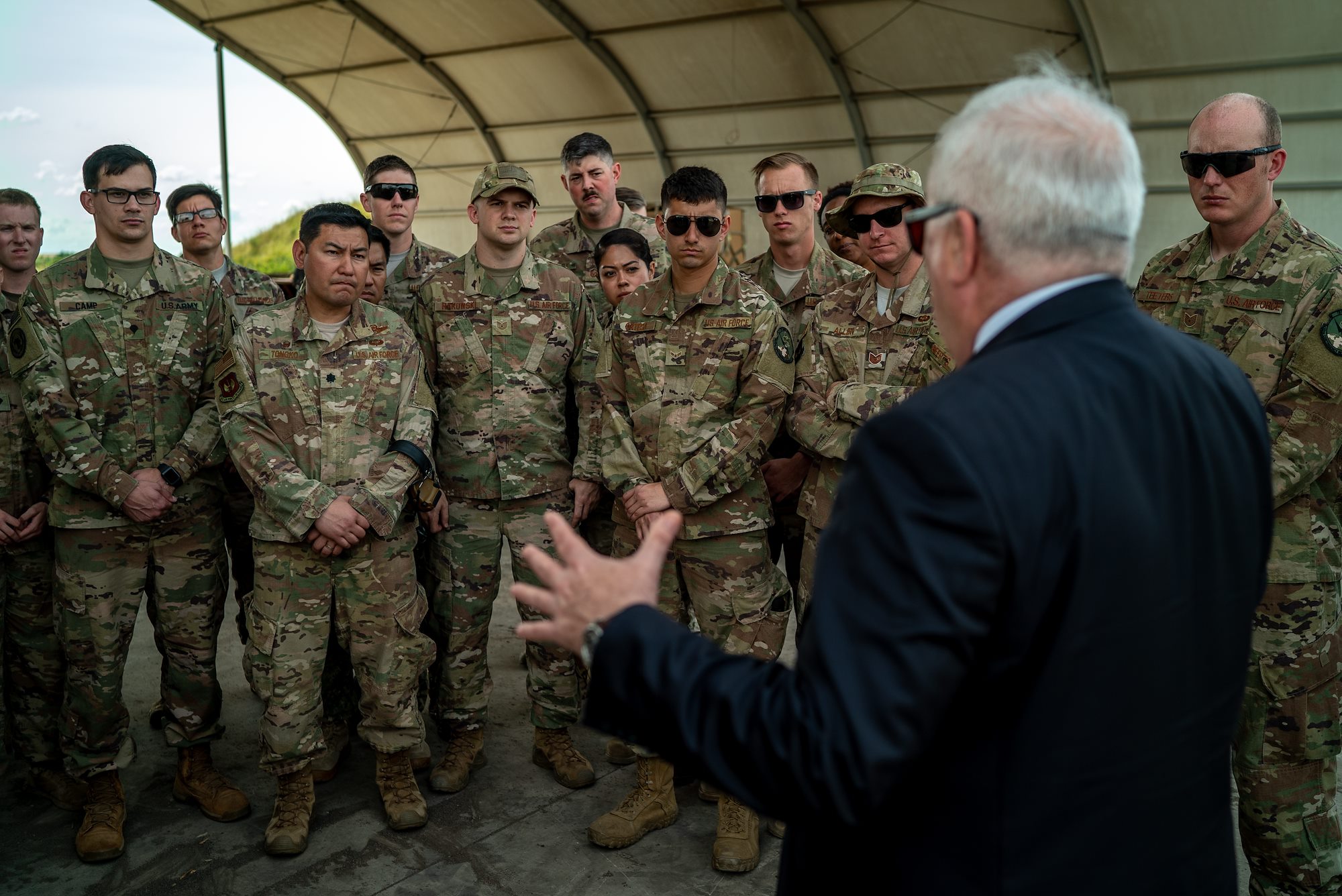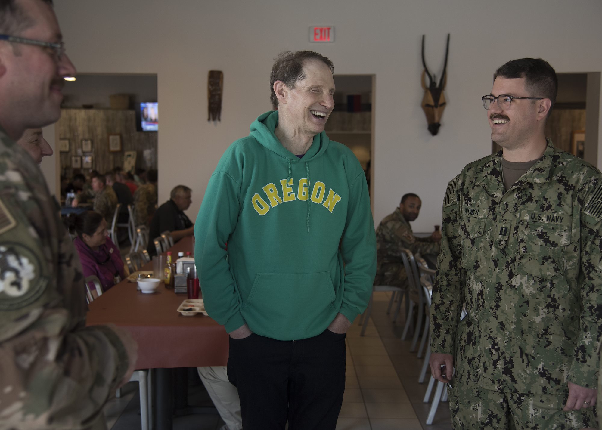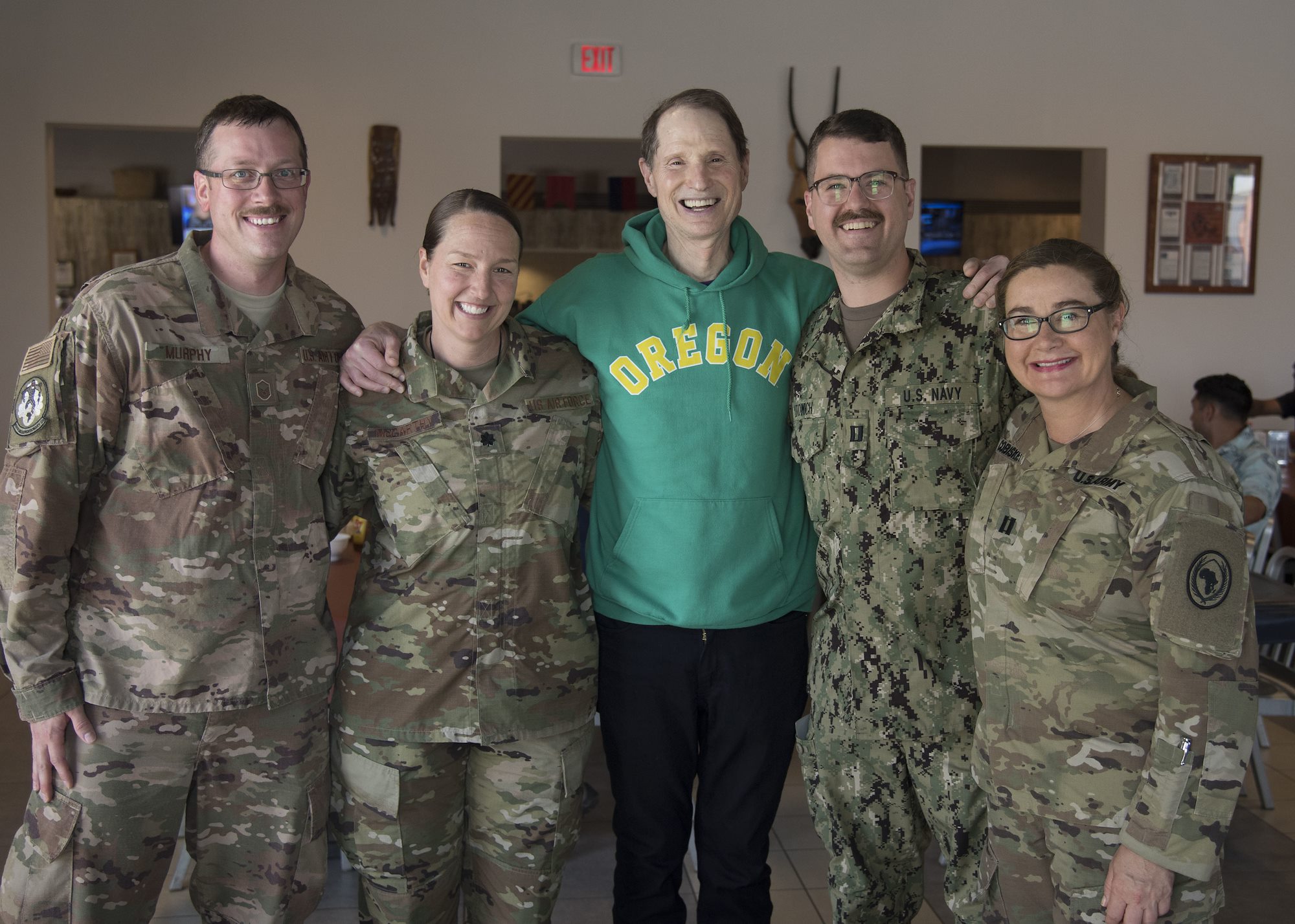 U.S. Sen. Ron Wyden (D-OR) meets with service members from Oregon deployed to Combined Joint Task Force-Horn of Africa (CJTF-HOA), Djibouti, April 26, 2019. Wyden traveled to Djibouti to visit U.S. forces and embassy officials and to meet with national defense leaders to understand the current posture of readiness and security. (U.S. Air Force photo by Senior Airman Kirsten Brandes)
