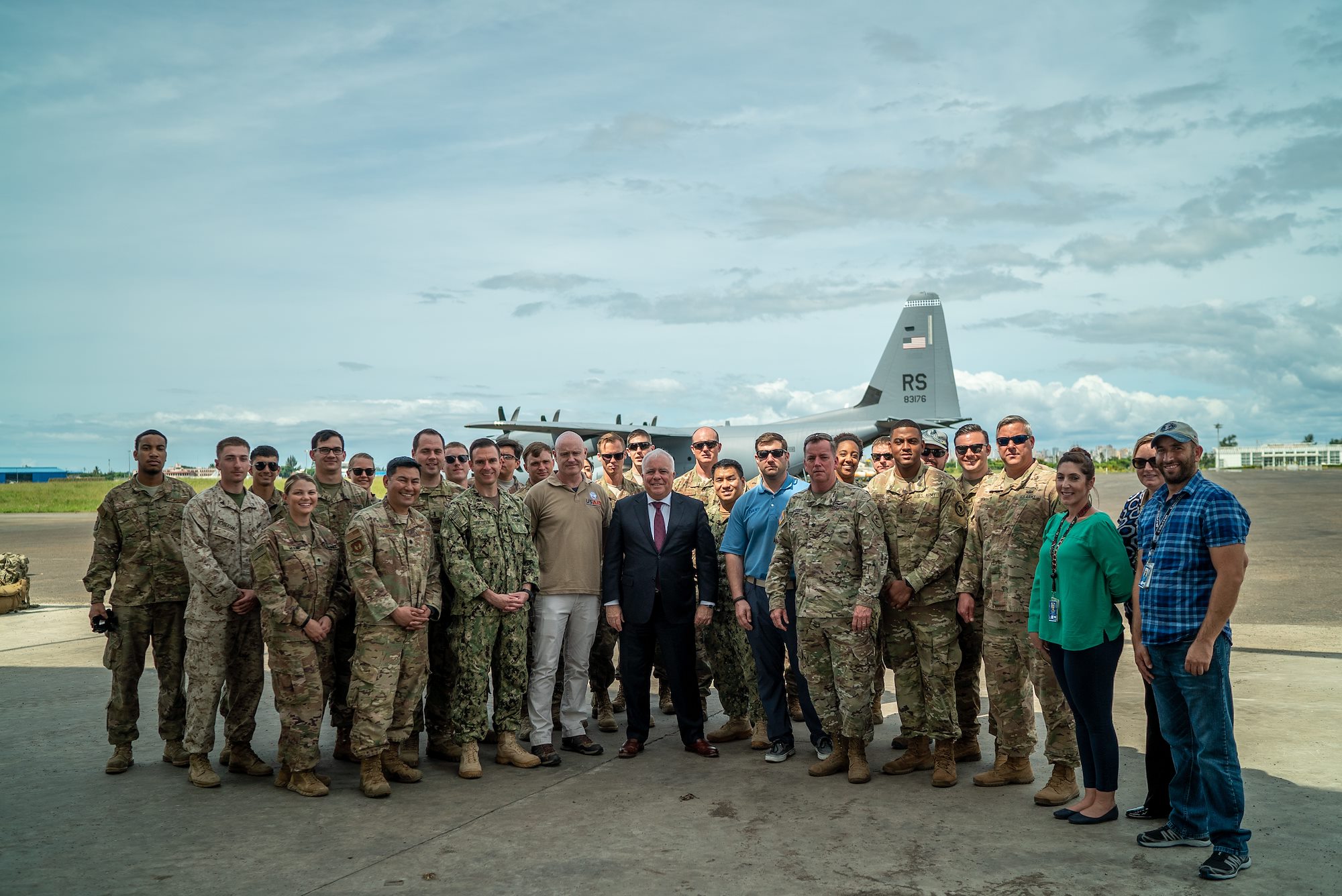 Dennis Walter Hearne, U.S. Ambassador to the Republic of Mozambique, poses for a photo with U.S. service members assigned to Combined Joint Task Force-Horn of Africa (CJTF-HOA) in Maputo, Mozambique, April 11, 2019. CJTF-HOA led U.S. Department of Defense Cyclone Idai relief efforts in support of U.S. Agency for International Development’s (USAID) Disaster Assistance Response Team. The task force helped meet requirements identified by USAID assessment teams and humanitarian organizations working in the region by providing logistics support and manpower to USAID at the request of the Government of the Republic of Mozambique. (U.S. Air Force photo by Tech. Sgt. Thomas Grimes)