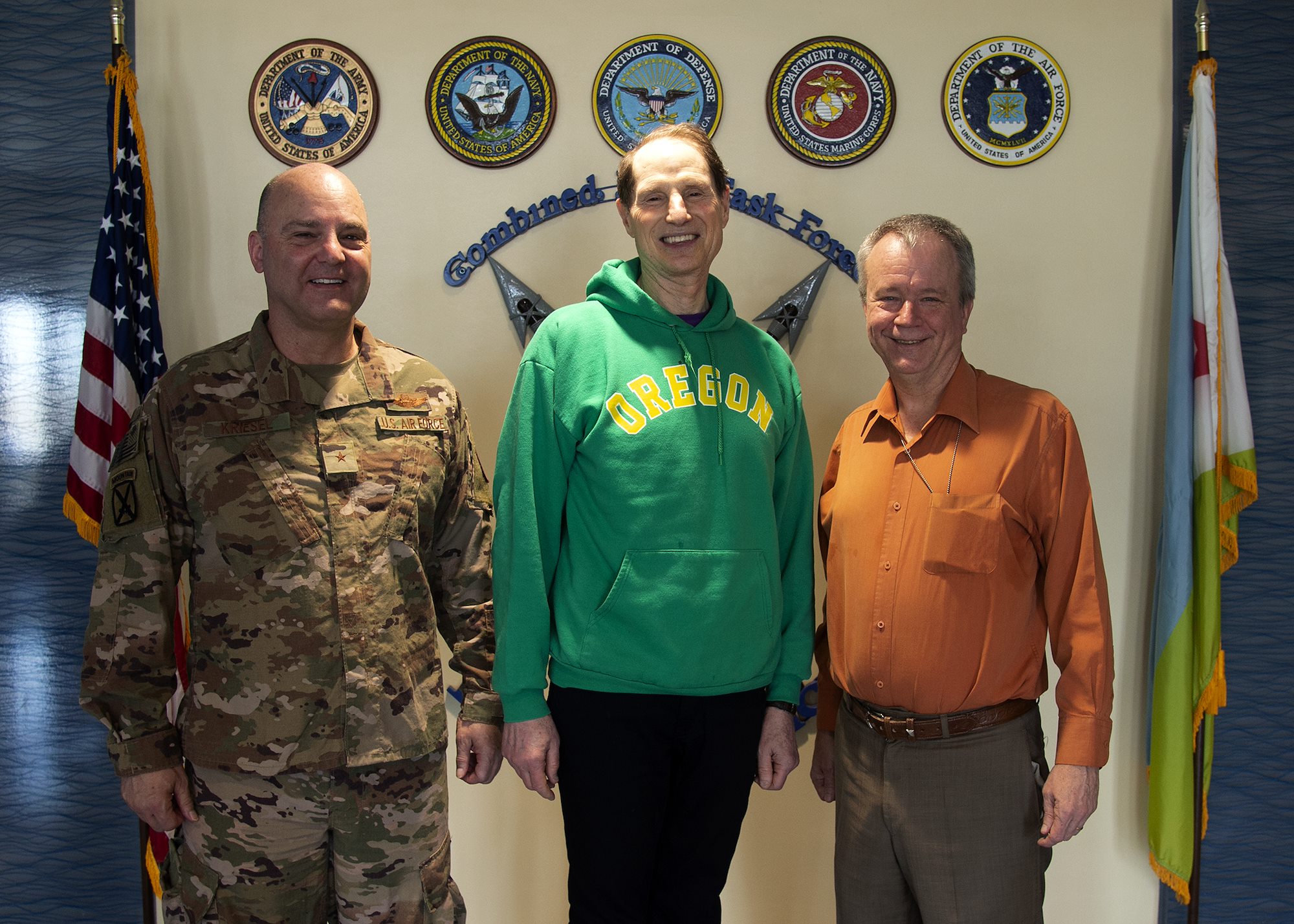 U.S. Air Force Brig. Gen. James R. Kriesel, left, deputy commanding general of Combined Joint Task Force-Horn of Africa (CJTF-HOA), U.S. Sen. Ron Wyden (D-OR), center, and U.S. Ambassador to Djibouti Larry André, right, pose for a photo at CJTF-HOA before a briefing at Camp Lemonnier, Djibouti, April 26, 2019. Wyden traveled to Djibouti to visit U.S. forces and embassy officials and to meet with national defense leaders to understand the current posture of readiness and security. (U.S. Navy photo by Mass Communication Specialist 1st Class Nick Scott)
