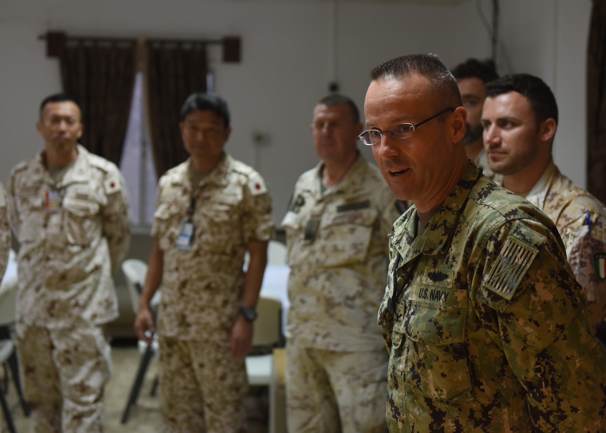 U.S. Navy Capt. Thomas Wall, chief of staff of Combined Joint Task Force-Horn of Africa (CJTF-HOA), bids farewell to multinational military partners during a CJTF-HOA cultural exchange event at Camp Lemonnier, Djibouti, April 24, 2019. CJTF-HOA holds monthly exchange events with multinational military partners affiliated with Camp Lemonnier to strengthen alliances and attract new partners in the combined joint military environment. (U.S. Air Force Photo by Staff Sgt. Franklin R. Ramos)