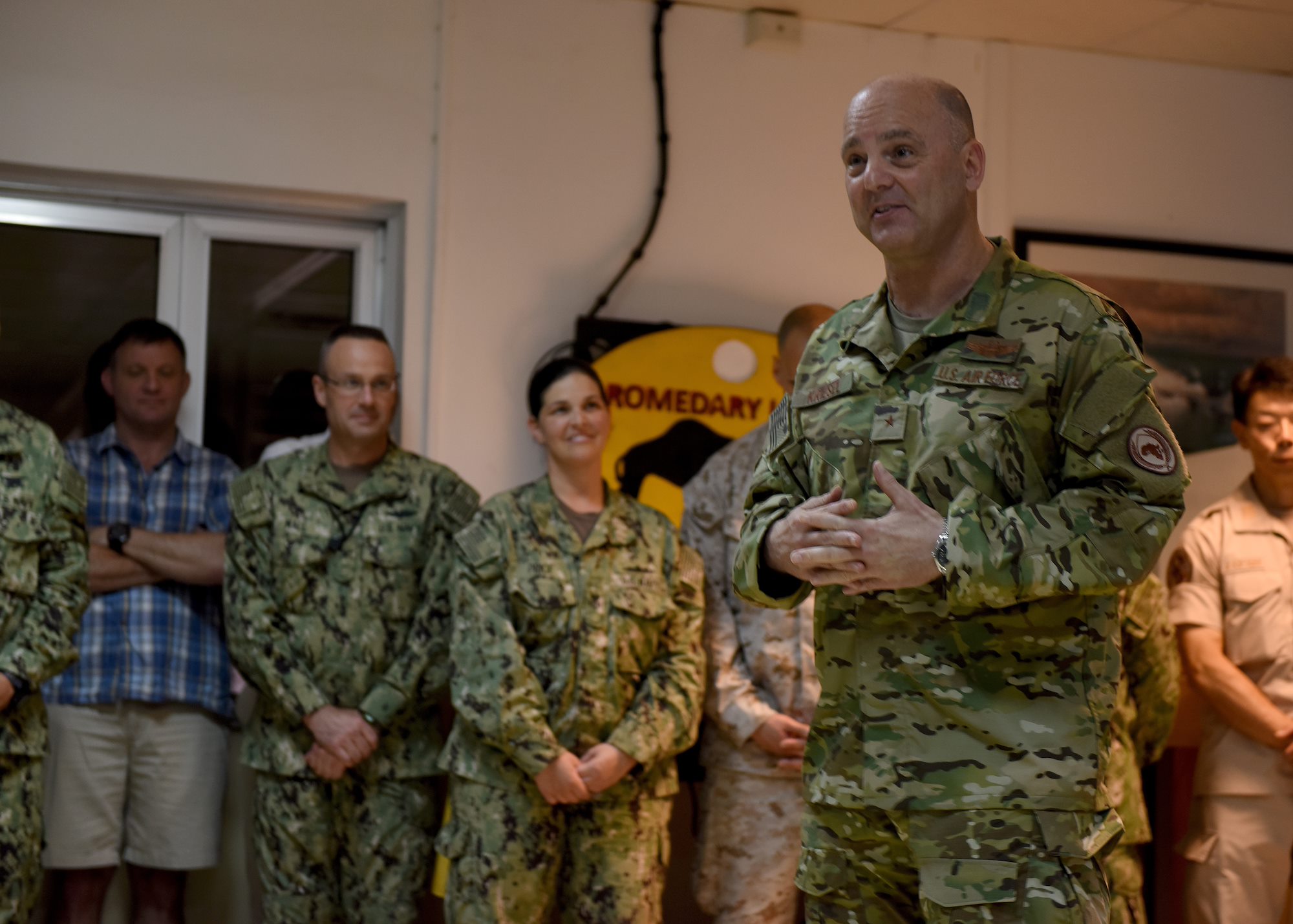 U.S. Air Force Brig. Gen. James R. Kriesel, deputy commanding general of Combined Joint Task Force-Horn of Africa (CJTF-HOA), speaks to multinational military partners during a CJTF-HOA cultural exchange event at Camp Lemonnier, Djibouti, April 24, 2019. CJTF-HOA holds monthly exchange events with multinational military partners affiliated with Camp Lemonnier to strengthen alliances and attract new partners in the combined joint military environment. (U.S. Air Force Photo by Staff Sgt. Franklin R. Ramos)