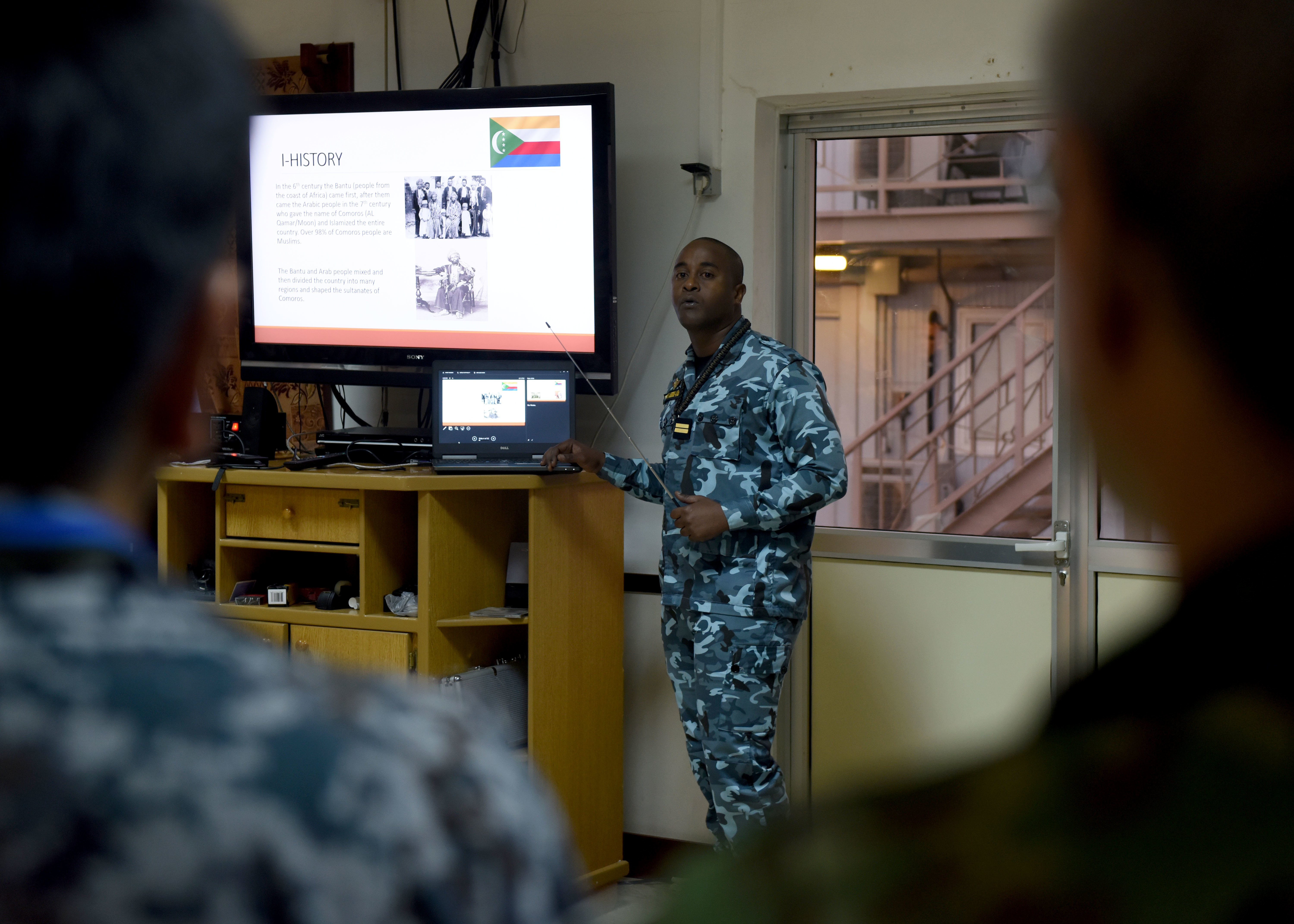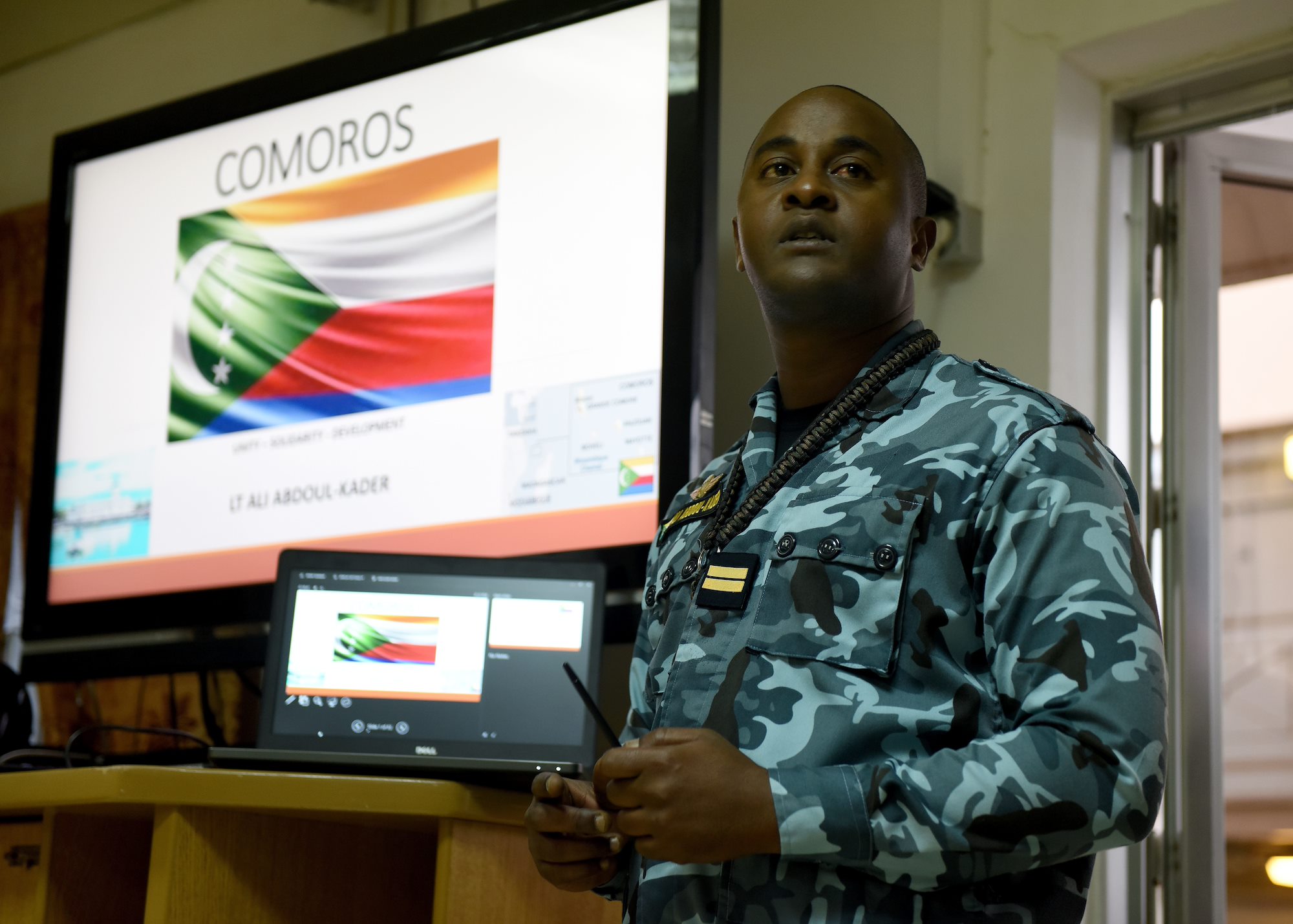 Comoros army Lt. Ali Abdoul-Kader, a foreign liaison officer for Combined Joint Task Force-Horn of Africa (CJTF-HOA), briefs multinational military partners about his country during a CJTF-HOA cultural exchange event at Camp Lemonnier, Djibouti, April 24, 2019. CJTF-HOA holds monthly exchange events with multinational military partners affiliated with Camp Lemonnier to strengthen alliances and attract new partners in the combined joint military environment. (U.S. Air Force Photo by Staff Sgt. Franklin R. Ramos)