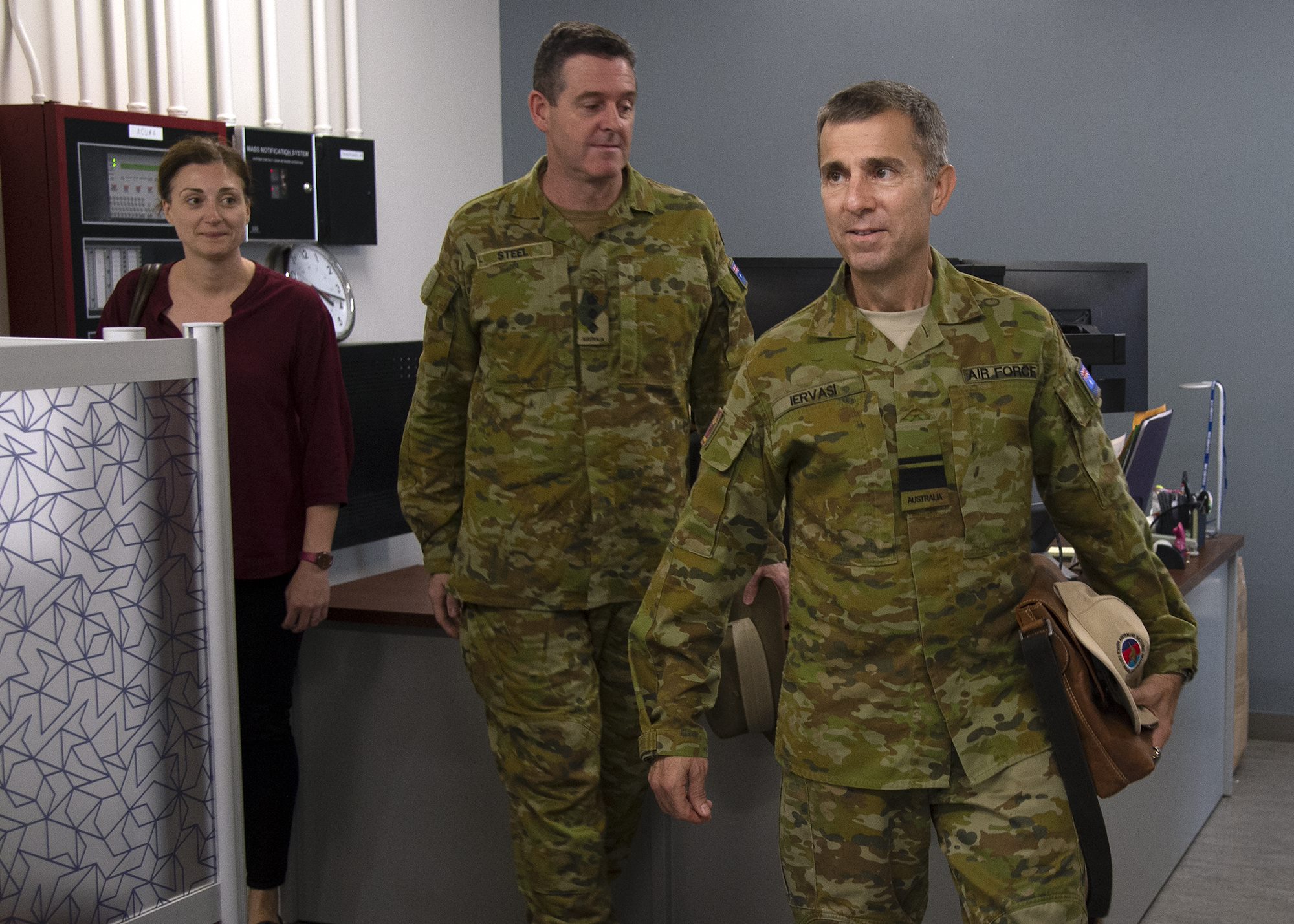 Royal Australian air force Air Vice-Marshal Vincent Iervasi, right, arrives at Combined Joint Task Force-Horn of Africa (CJTF-HOA) to meet with CJTF-HOA leadership at Camp Lemonnier, Djibouti, May 7, 2019. Iervasi visited CJTF-HOA to discuss the continued partnership in Africa between Australia and the United States. (U.S. Navy photo by Mass Communication Specialist 1st Class Nick Scott)
