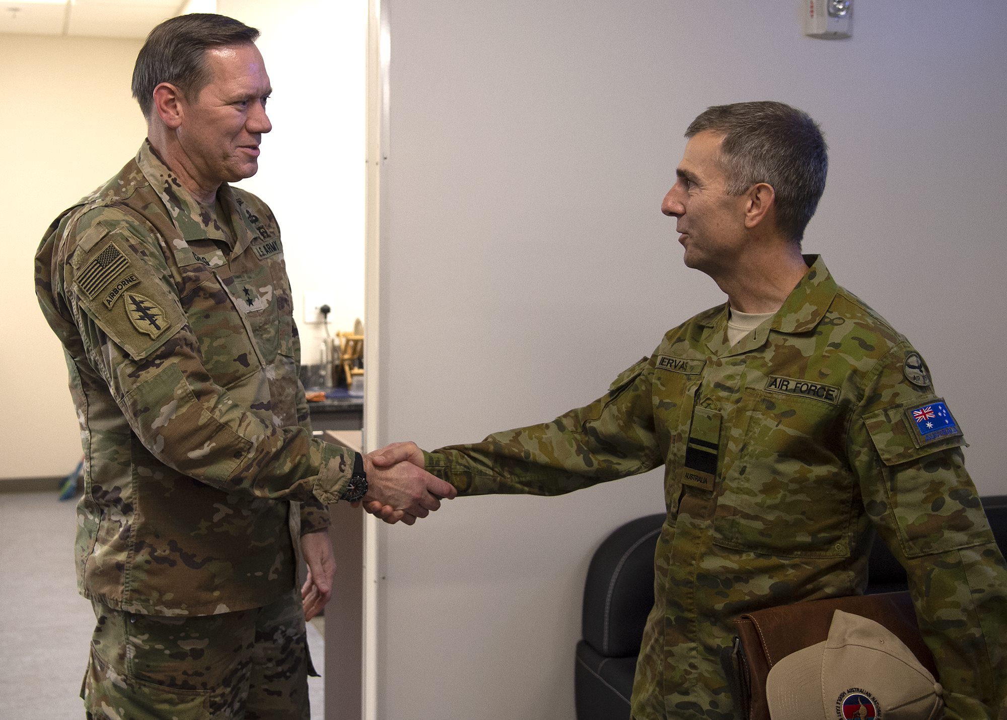 U.S. Army Maj. Gen. James D. Craig, left, commanding general, Combined Joint Task Force-Horn of Africa (CJTF-HOA), shakes hands with Royal Australian air force Air Vice-Marshal Vincent Iervasi as he arrives at Combined Joint Task Force-Horn of Africa (CJTF-HOA), Camp Lemonnier, Djibouti, May 7, 2019. Iervasi visited CJTF-HOA to discuss the continued partnership in Africa between Australia and the United States. (U.S. Navy photo by Mass Communication Specialist 1st Class Nick Scott)