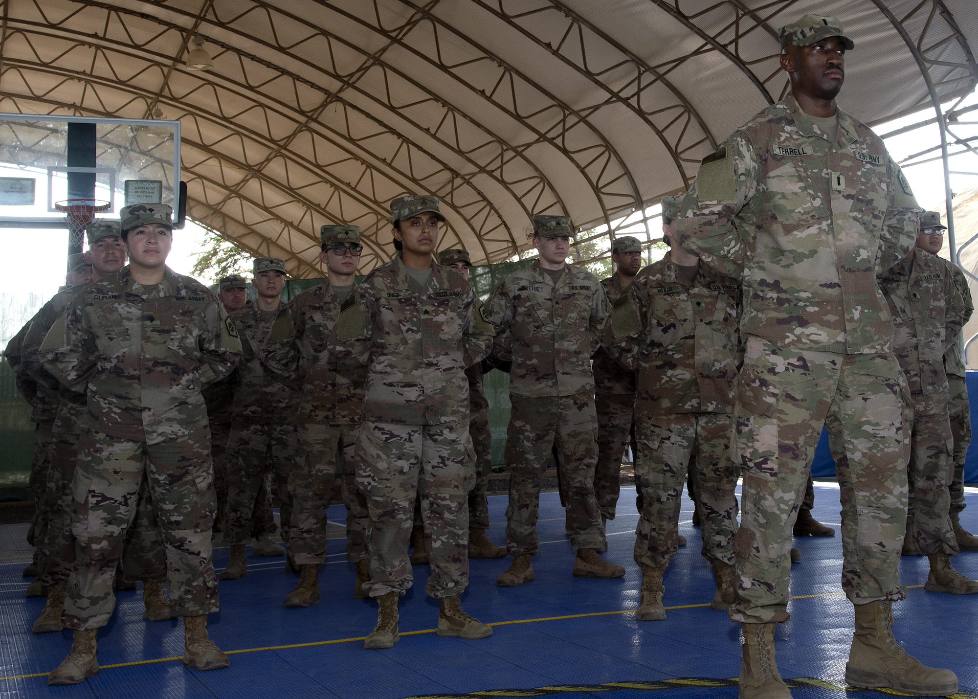 U.S. Army Soldiers assigned to Combined Joint Task Force-Horn of Africa (CJTF-HOA), stand at attention before a combat patching ceremony at Camp Lemonnier, Djibouti, May 10, 2019. U.S. Army combat patches signify a Soldier’s service in a combat zone. (U.S. Navy photo by Mass Communication Specialist 1st Class Nick Scott)