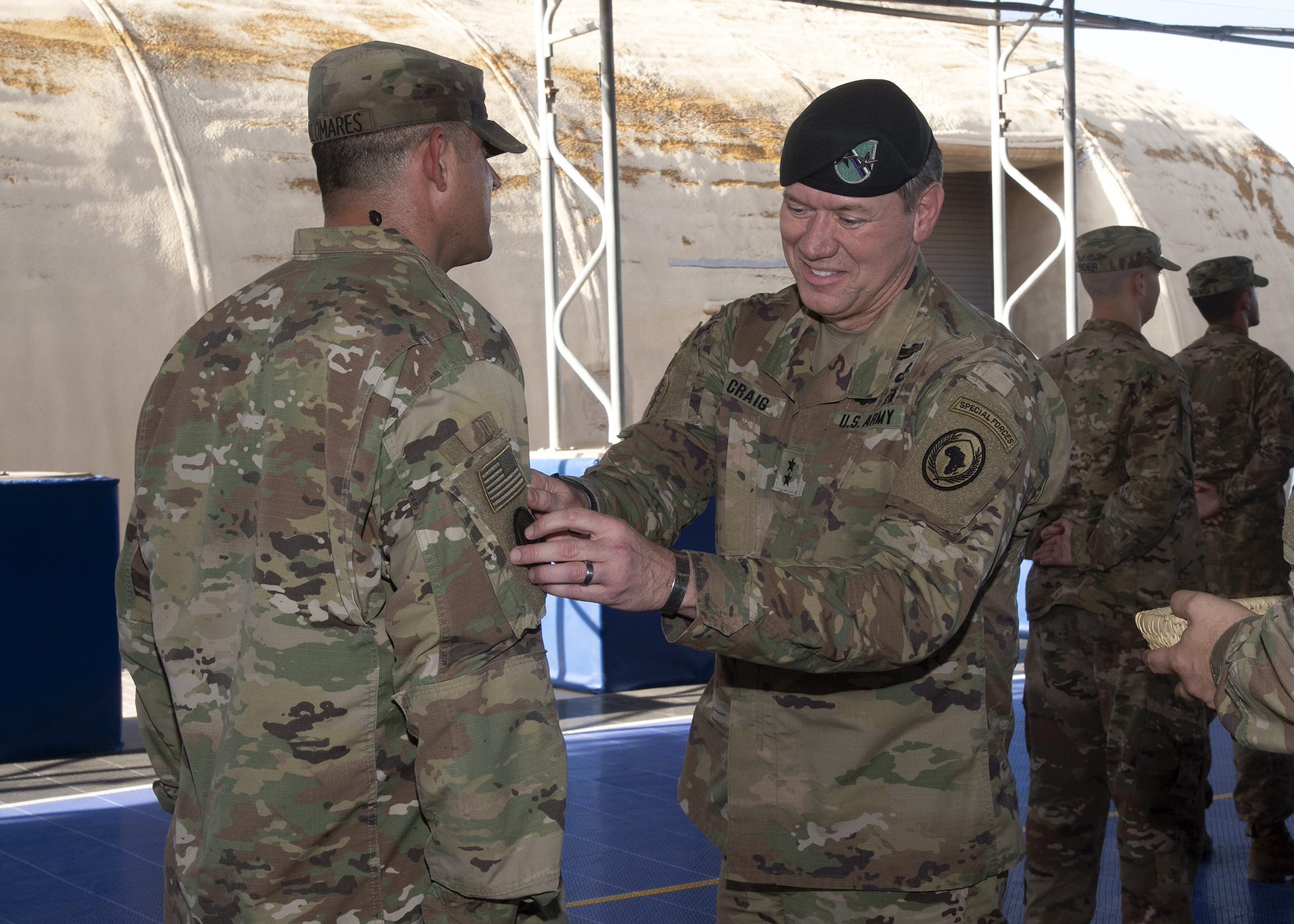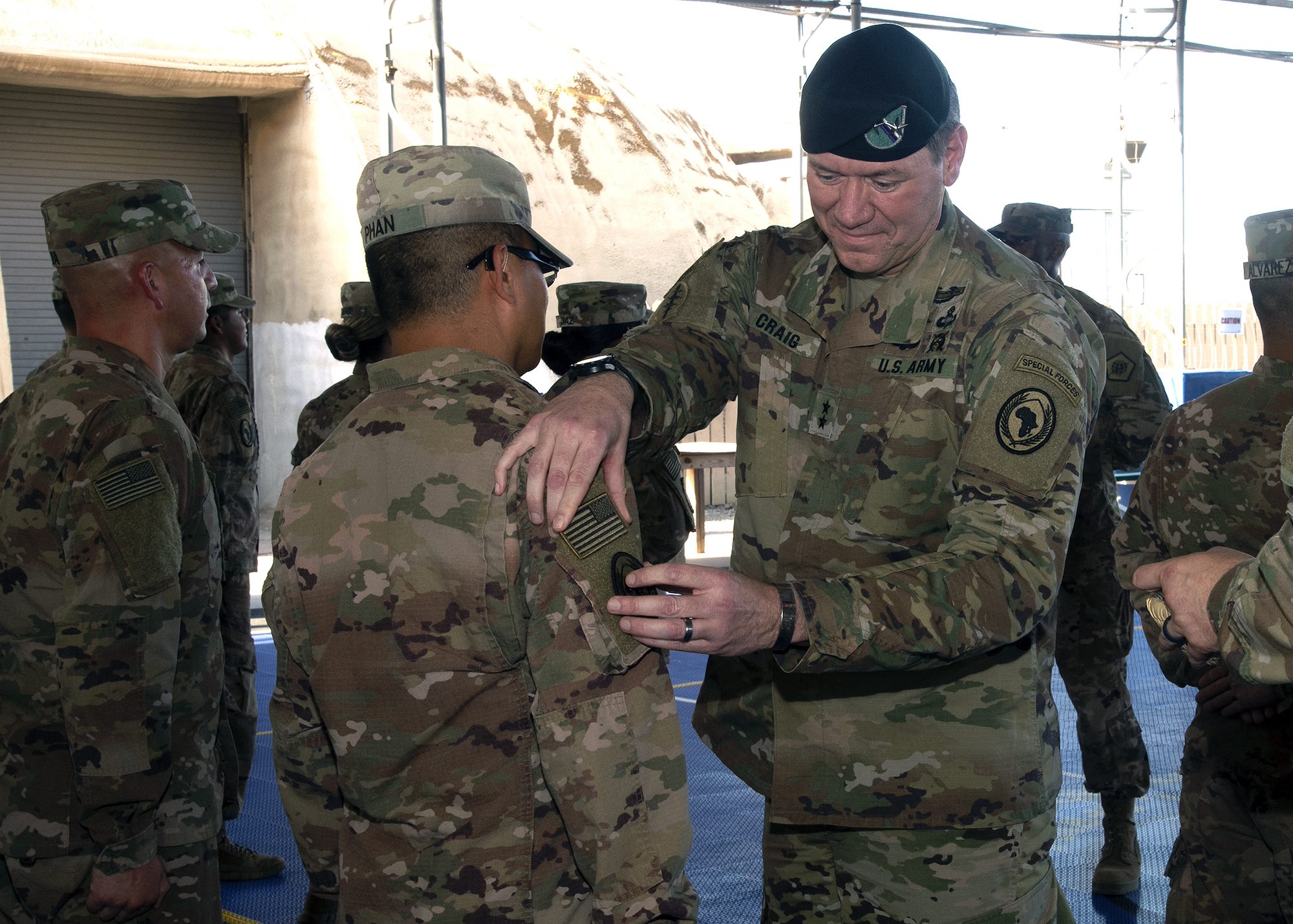 U.S. Army Maj. Gen. James D. Craig, right, commanding general, Combined Joint Task Force-Horn of Africa (CJTF-HOA), presents U.S. Army Master Sgt. Eduardo Palomares a combat patch during a patching ceremony for U.S. Army Soldiers assigned to CJTF-HOA, at Camp Lemonnier, Djibouti, May 10, 2019. Army combat patches signify a Soldier’s service in a combat zone and represent service in a member’s current, or prior, unit. (U.S. Navy photo by Mass Communication Specialist 1st Class Nick Scott)