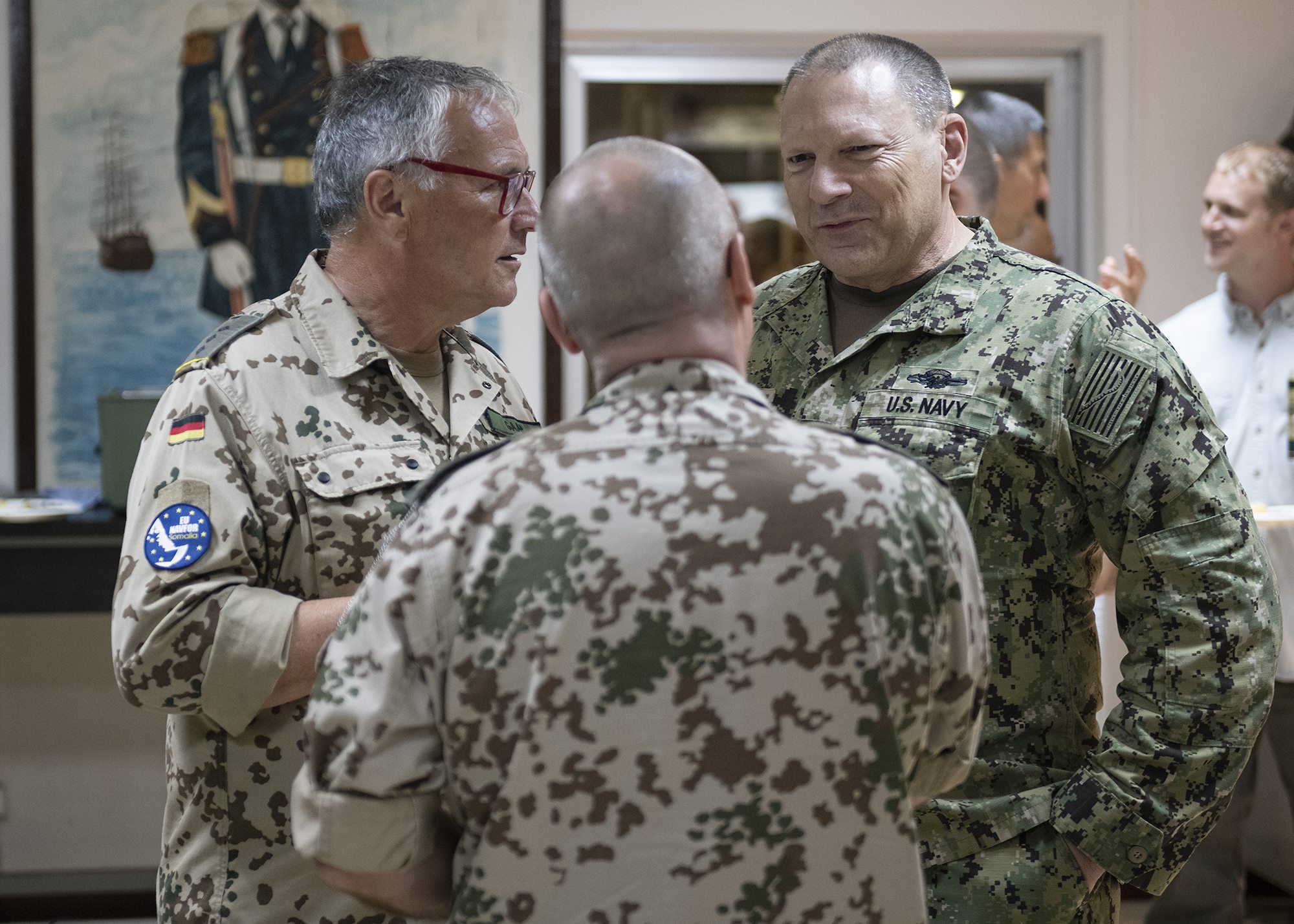 European Union’s integrated approach to combat piracy and armed robbery at sea off the Horn of Africa, during a cultural exchange event at Camp Lemonnier, Djibouti, Feb. 27, 2019. Multinational military partners affiliated with Camp Lemonnier hold monthly exchange events to strengthen alliances and attract new partners in the combined joint military environment. (U.S. Air Force photo by Tech. Sgt. Shawn Nickel)