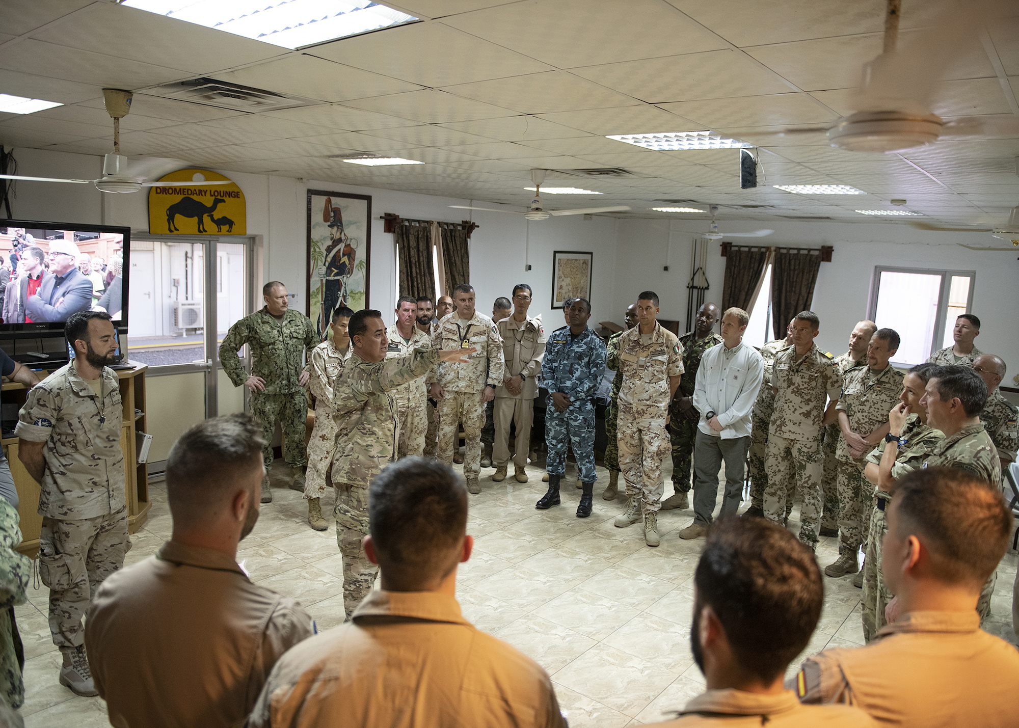 Multinational military partners gather for opening remarks during a cultural exchange event at Camp Lemonnier, Djibouti, Feb. 27, 2019. Multinational military partners affiliated with Camp Lemonnier hold monthly exchange events to strengthen alliances and attract new partners in the combined joint military environment. (U.S. Air Force photo by Tech. Sgt. Shawn Nickel)