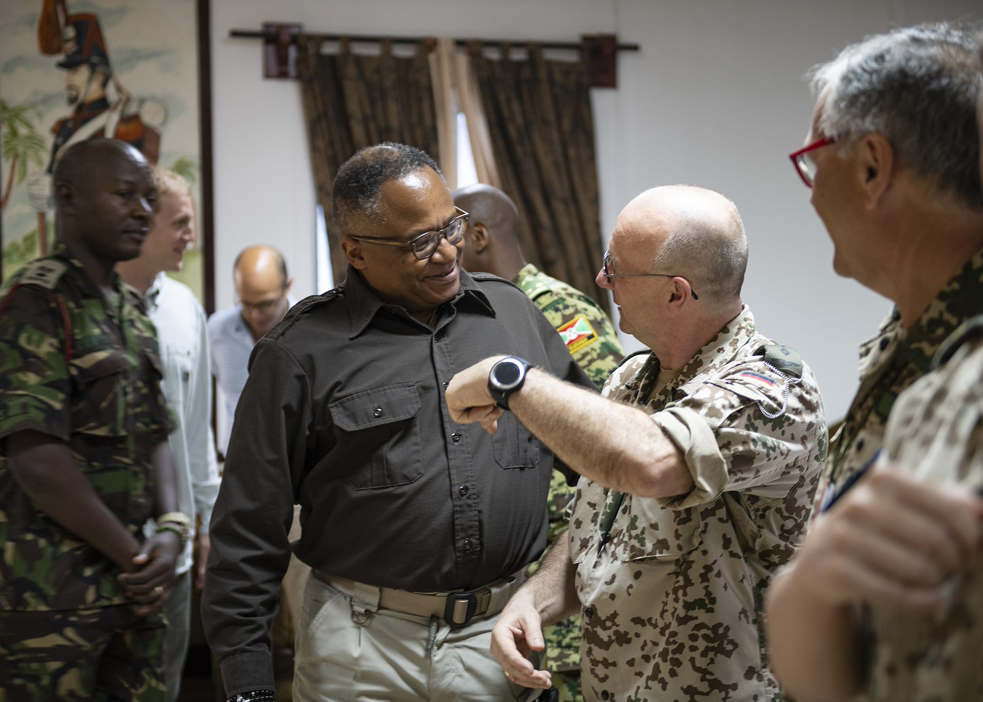 Irvin Hicks Jr., foreign policy advisor (POLAD) for Combined Joint Task Force-Horn of Africa, greets multinational military partners during a cultural exchange event at Camp Lemonnier, Djibouti, Feb. 27, 2019. Multinational military partners affiliated with Camp Lemonnier hold monthly exchange events to strengthen alliances and attract new partners in the combined joint military environment. (U.S. Air Force photo by Tech. Sgt. Shawn Nickel)