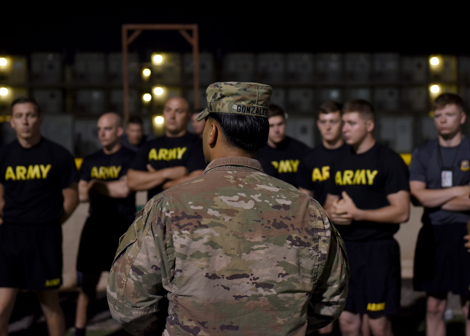 U.S. Army Sgt. 1st Class Angel Gonzalez, the operations NCO in charge of the 403rd Civil Affairs Battalion, assigned to Combined Joint Task Force-Horn of Africa (CJTF-HOA) Civil Affairs, gives a speech prior to the joint fitness test portion of the Joint Warrior Competition at Camp Lemonnier, Djibouti, Feb. 26, 2019. U.S. service members assigned to CJTF-HOA and Camp Lemonnier participated in the fitness test, which consisted of components of each services’ annual physical fitness exams. (U.S. Air Force Photo by Staff Sgt. Franklin R. Ramos)