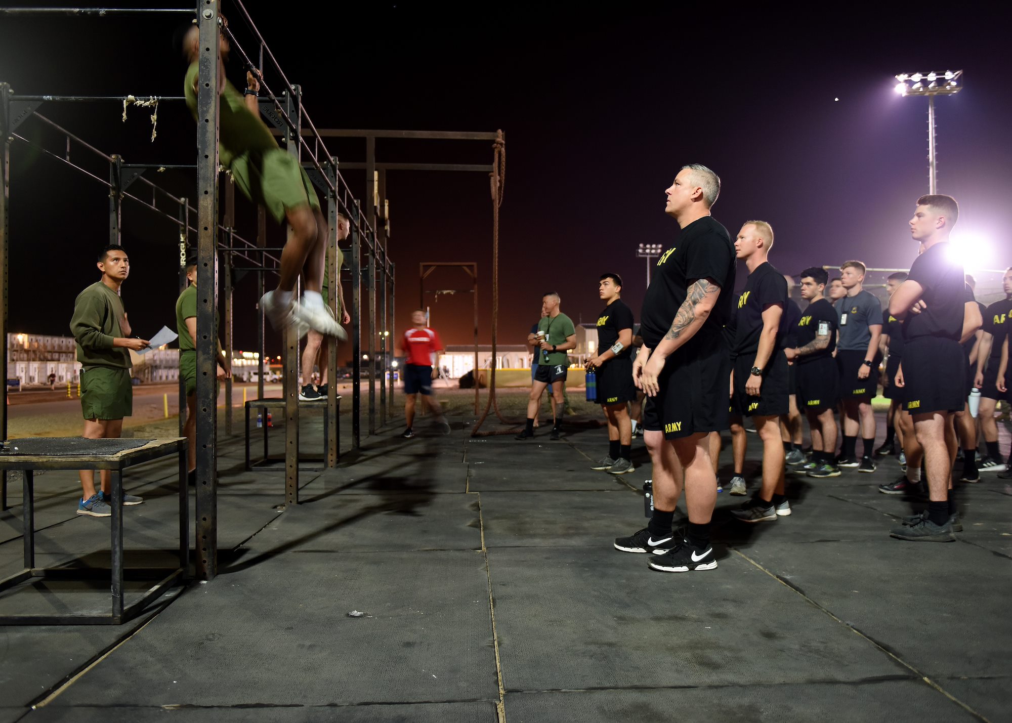 U.S. Marines assigned to Combined Joint Task Force-Horn of Africa (CJTF-HOA) demonstrate pull-ups during the joint fitness test portion of the Joint Warrior Competition at Camp Lemonnier, Djibouti, Feb. 26, 2019. U.S. service members assigned to CJTF-HOA and Camp Lemonnier participated in the fitness test, which consisted of components of each services’ physical fitness exams to include Marine pull-ups. (U.S. Air Force Photo by Staff Sgt. Franklin R. Ramos)