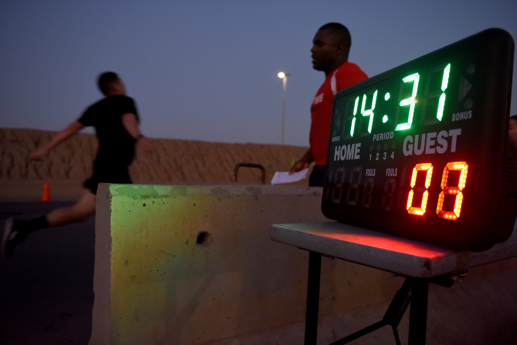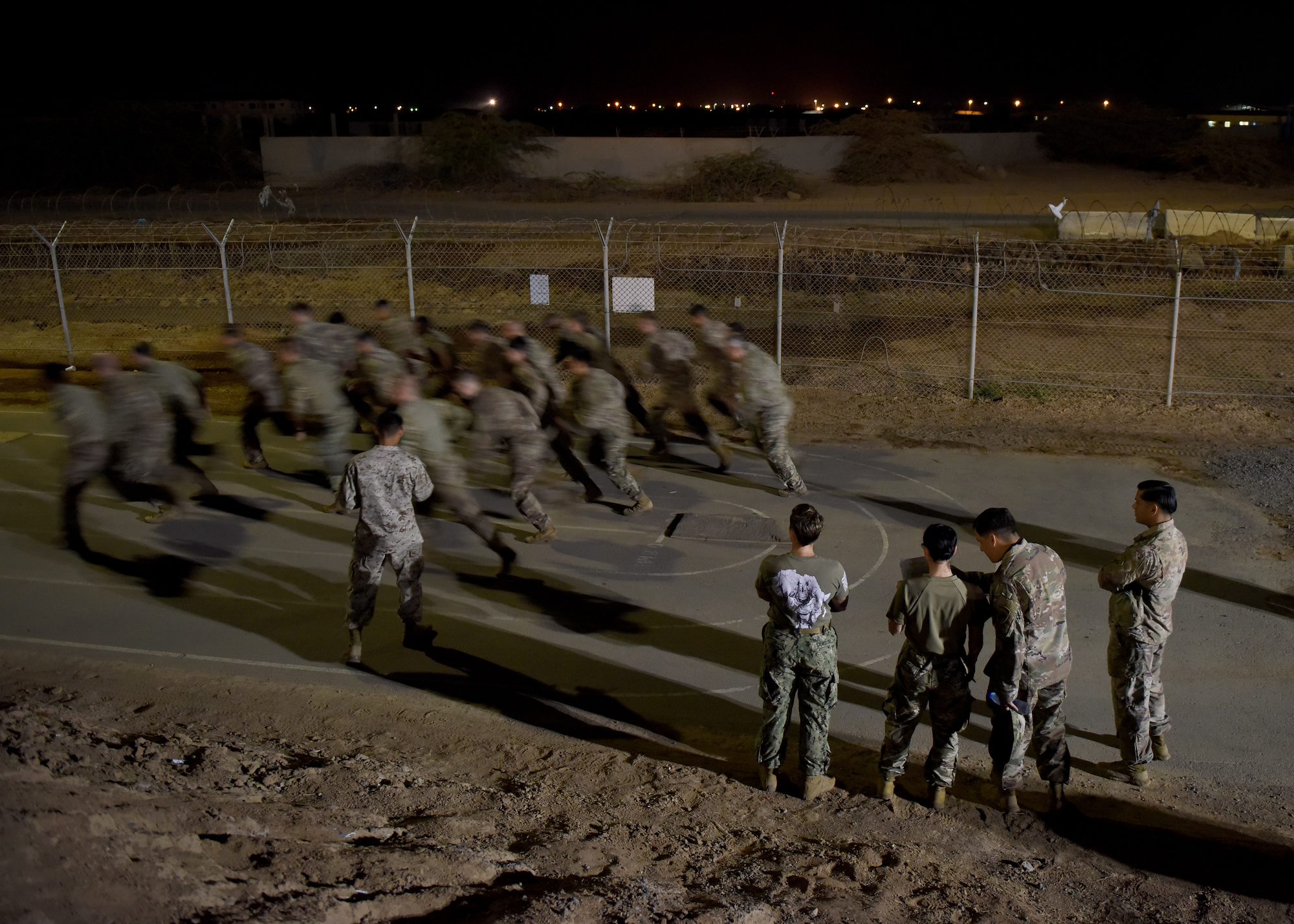 U.S. Army Soldiers, assigned to Combined Joint Task Force-Horn of Africa (CJTF-HOA), start the U.S. Marine Corps combat fitness test (CFT) portion of the Joint Warrior Competition at Camp Lemonnier, Djibouti, March 1, 2019. The CFT, which consisted of an 880-meter run, 2-minute ammo can lift and a maneuver under fire course, was part of the four-day competition that was open to U.S. service members assigned to CJTF-HOA and Camp Lemonnier. (U.S. Air Force Photo by Staff Sgt. Franklin R. Ramos)