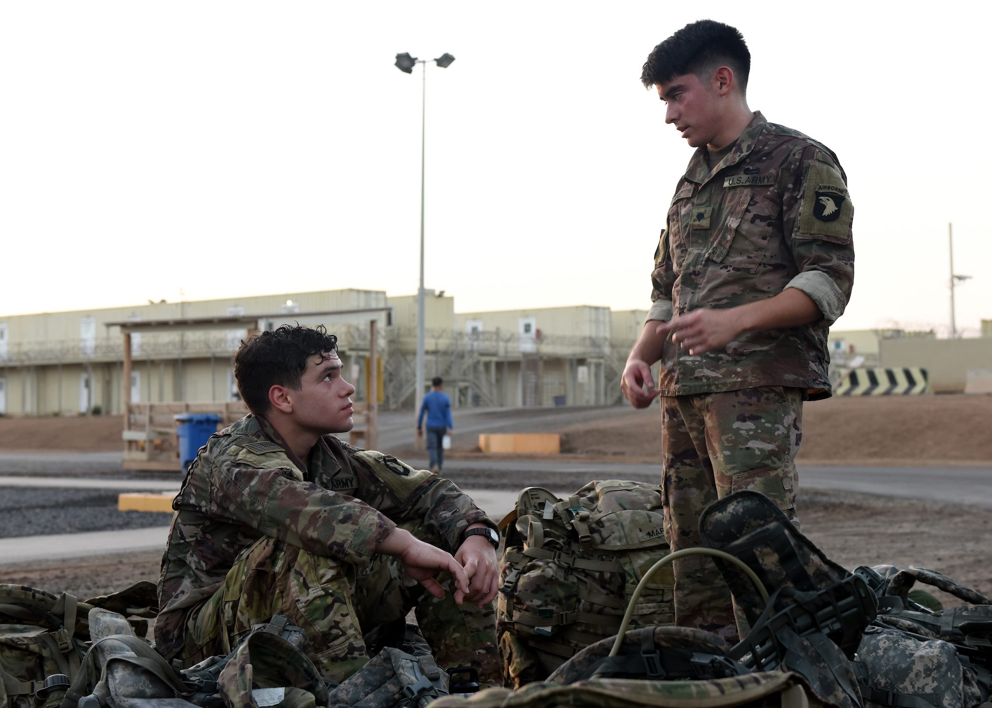U.S. Army Pfc. Matthew Torres (left) and U.S. Army Spc. Michael Perez, infantrymen from Bravo Company 1-26 Infantry, 101st Airborne Division, East Africa Response Force, assigned to Combined Joint Task Force-Horn of Africa (CJTF-HOA), talk after completing a ruck march for the Joint Warrior Competition at Camp Lemonnier, Djibouti, Feb. 27, 2019. The event, open to U.S. service members assigned to Combined Joint Task Force-Horn of Africa and Camp Lemonnier, consisted of a 6-mile ruck march with participants carrying bags that weighed at least 35 pounds. (U.S. Air Force Photo by Staff Sgt. Franklin R. Ramos)