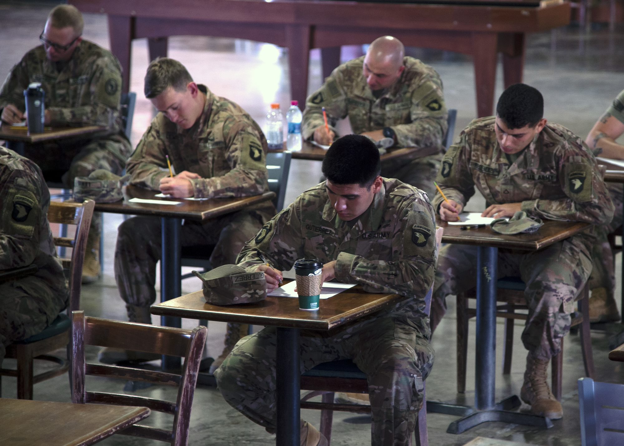 U.S. Army Soldiers assigned to Combined Joint Task Force-Horn of Africa (CJTF-HOA) write during the essay portion of the Joint Warrior Competition (JWC) at Camp Lemonnier, Djibouti, Feb. 26, 2019. The JWC was open to U.S. service members assigned to CJTF-HOA and Camp Lemonnier, and consisted of a 6-mile ruck march with participants carrying bags that weighed no less than 35 pounds, a timed first-aid administration challenge, a timed weapons disassembly and reassembly challenge, a timed essay writing contest, a joint physical training challenge and a combat fitness test. (U.S. Navy photo by Mass Communication Specialist 1st Class Nick Scott)