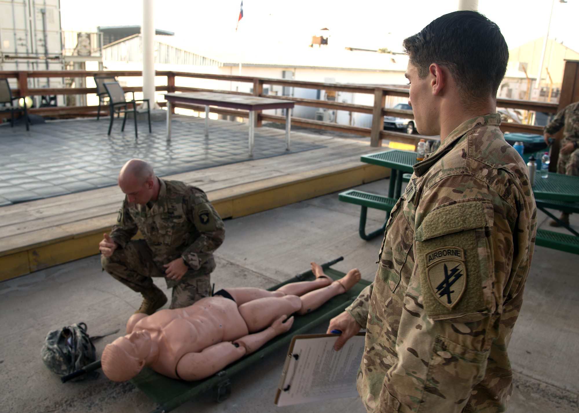 U.S. Army Sgt. Connor Lane, right, from the 403rd Civil Affairs Battalion, assigned to Combined Joint Task Force-Horn of Africa (CJTF-HOA) observes U.S. Army Staff Sgt. Tyler Wisely, a Soldier from Bravo Company 1-26 Infantry, 101st Airborne Division, East Africa Response Force, assigned to CJTF-HOA, while he administers first aid during the Joint Warrior Competition (JWC) at Camp Lemonnier, Djibouti, Feb. 27, 2019. The JWC was open to U.S. service members assigned to CJTF-HOA and Camp Lemonnier, and consisted of a 6-mile ruck march with participants carrying bags that weighed no less than 35 pounds, a timed first-aid administration challenge, a timed weapons disassembly and reassembly challenge, a timed essay writing contest, a joint physical training challenge and a combat fitness test. (U.S. Navy photo by Mass Communication Specialist 1st Class Nick Scott)