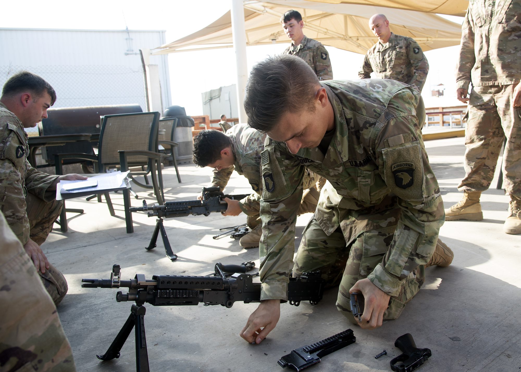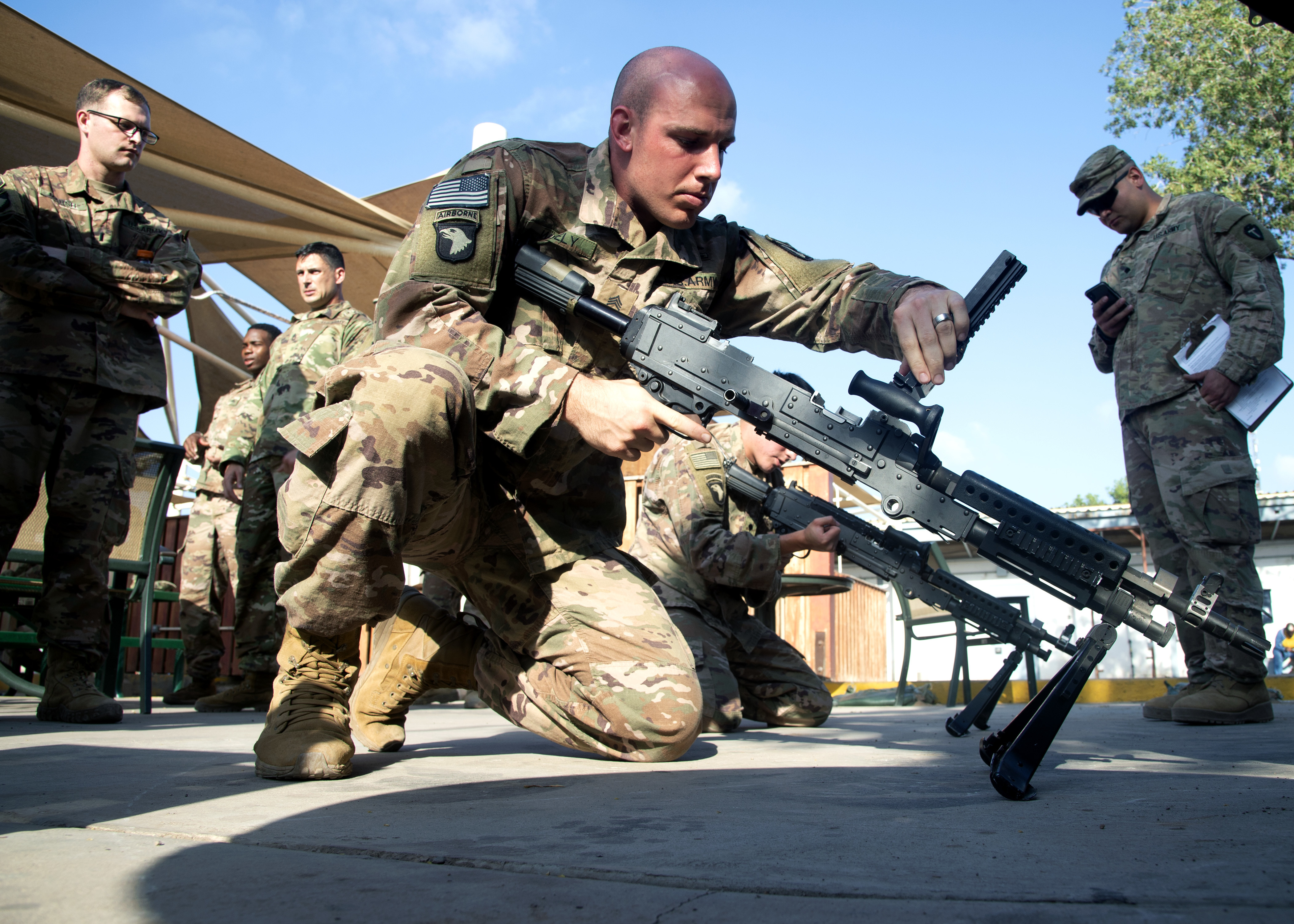 U.S. Army Staff Sgt. Tyler Wisely, a Soldier from Bravo Company 1-26 Infantry, 101st Airborne Division, East Africa Response Force, assigned to Combined Joint Task Force-Horn of Africa (CJTF-HOA), reassembles an M240 machine gun during the Joint Warrior Competition (JWC) at Camp Lemonnier, Djibouti, Feb. 28, 2019. The JWC was open to U.S. service members assigned to CJTF-HOA and Camp Lemonnier, and consisted of a 6-mile ruck march with participants carrying bags that weighed no less than 35 pounds, a timed first-aid administration challenge, a timed weapons disassembly and reassembly challenge, a timed essay writing contest, a joint physical training challenge and a combat fitness test. (U.S. Navy photo by Mass Communication Specialist 1st Class Nick Scott)