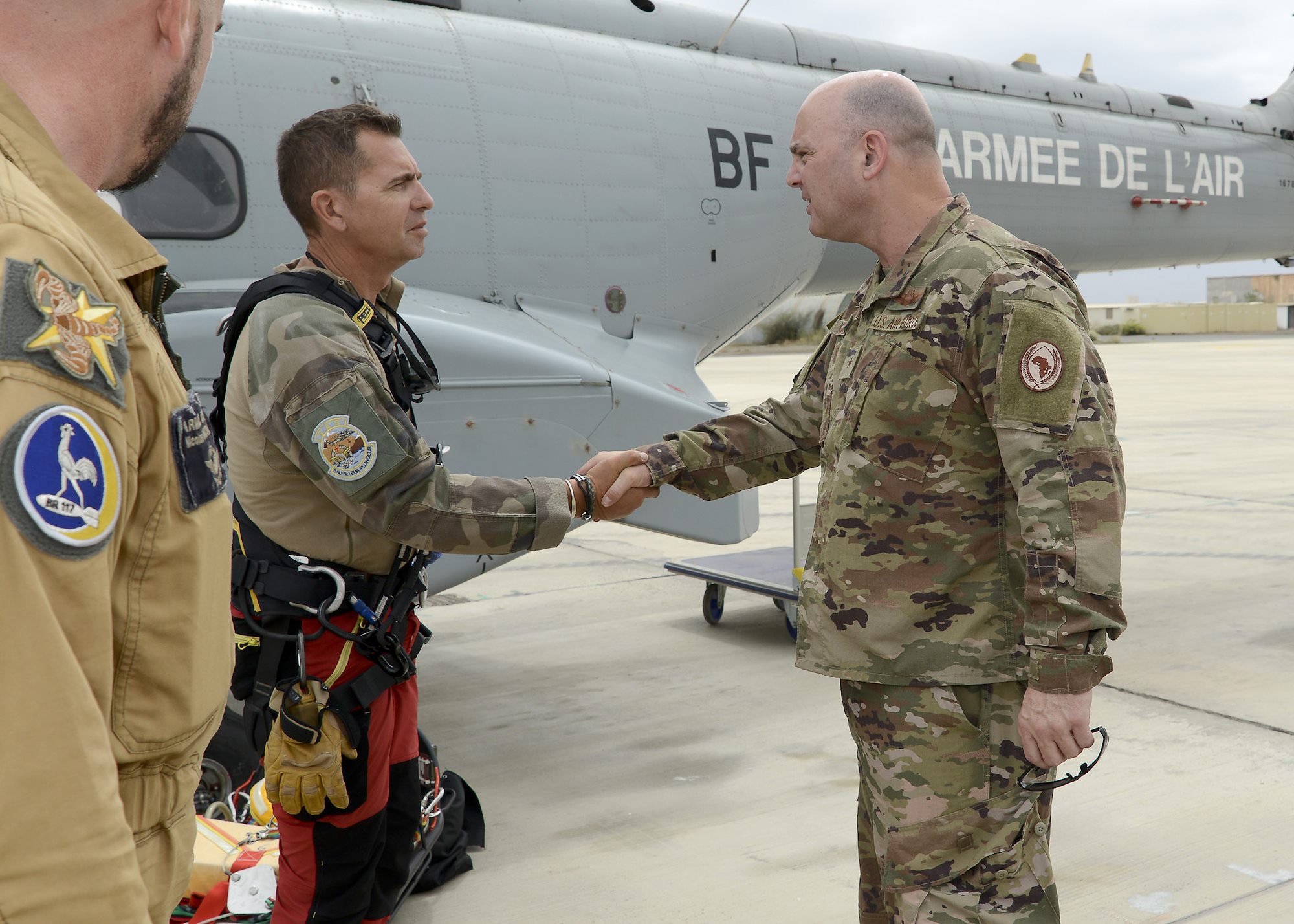 French air force Chief Master Sgt. Franck (left), rescue team NCO, greets U.S. Air Force Brig. Gen. James R. Kriesel, deputy commanding general of Combined Joint Task Force-Horn of Africa (CJTF-HOA), during his visit to French Air Force Base 188, Djibouti, Feb. 19, 2019. Kriesel visited the French base to gain insight into their assets and capabilities as a U.S. ally in CJTF-HOA’s combined joint operations area. (Courtesy Photo)