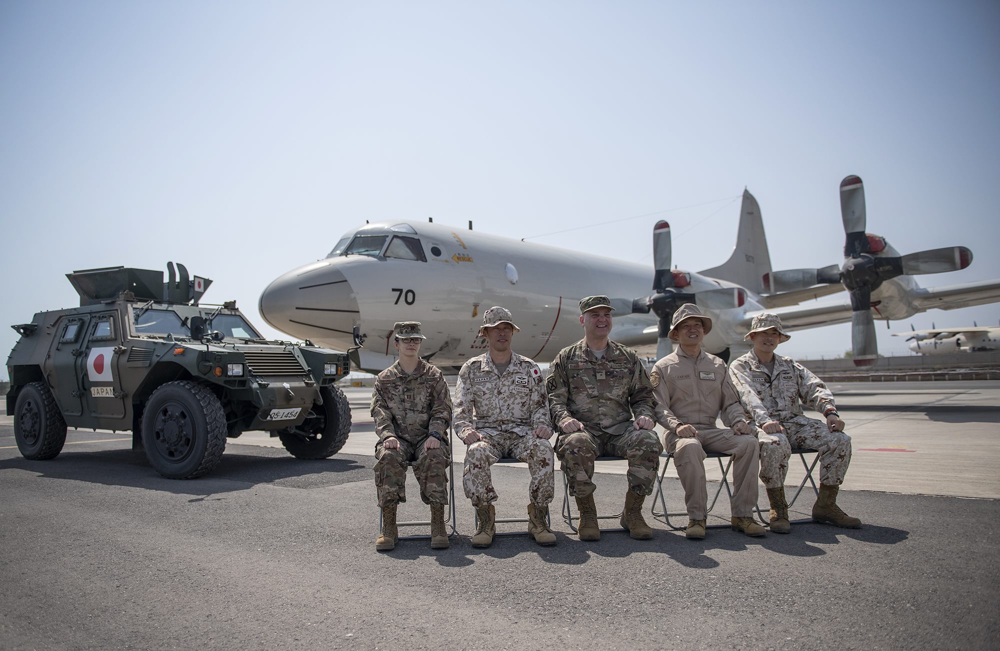 U.S. Air Force Brig. Gen. James R. Kriesel, deputy commanding general, Combined Joint Task Force-Horn of Africa (CJTF-HOA), and his aide-de-camp, U.S. Air Force Capt. Sharya Qureshi, pose for a photo with Japanese Maritime Self Defense Force (JMSDF) partners during a familiarization meet and greet March 4, 2019, in Djibouti. The meeting served as an opportunity for CJTF-HOA leadership to gain a better perspective of the JMSDF mission. (U.S. Air Force photo by Tech. Sgt. Shawn Nickel)