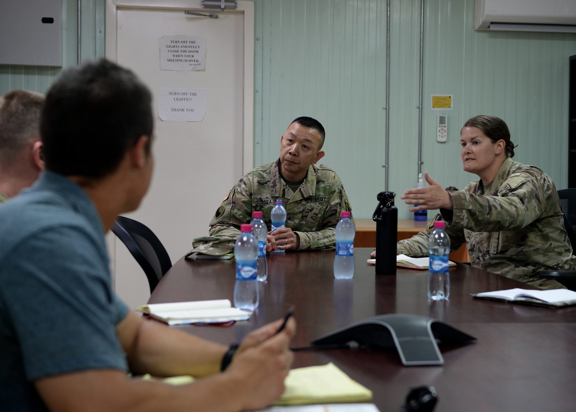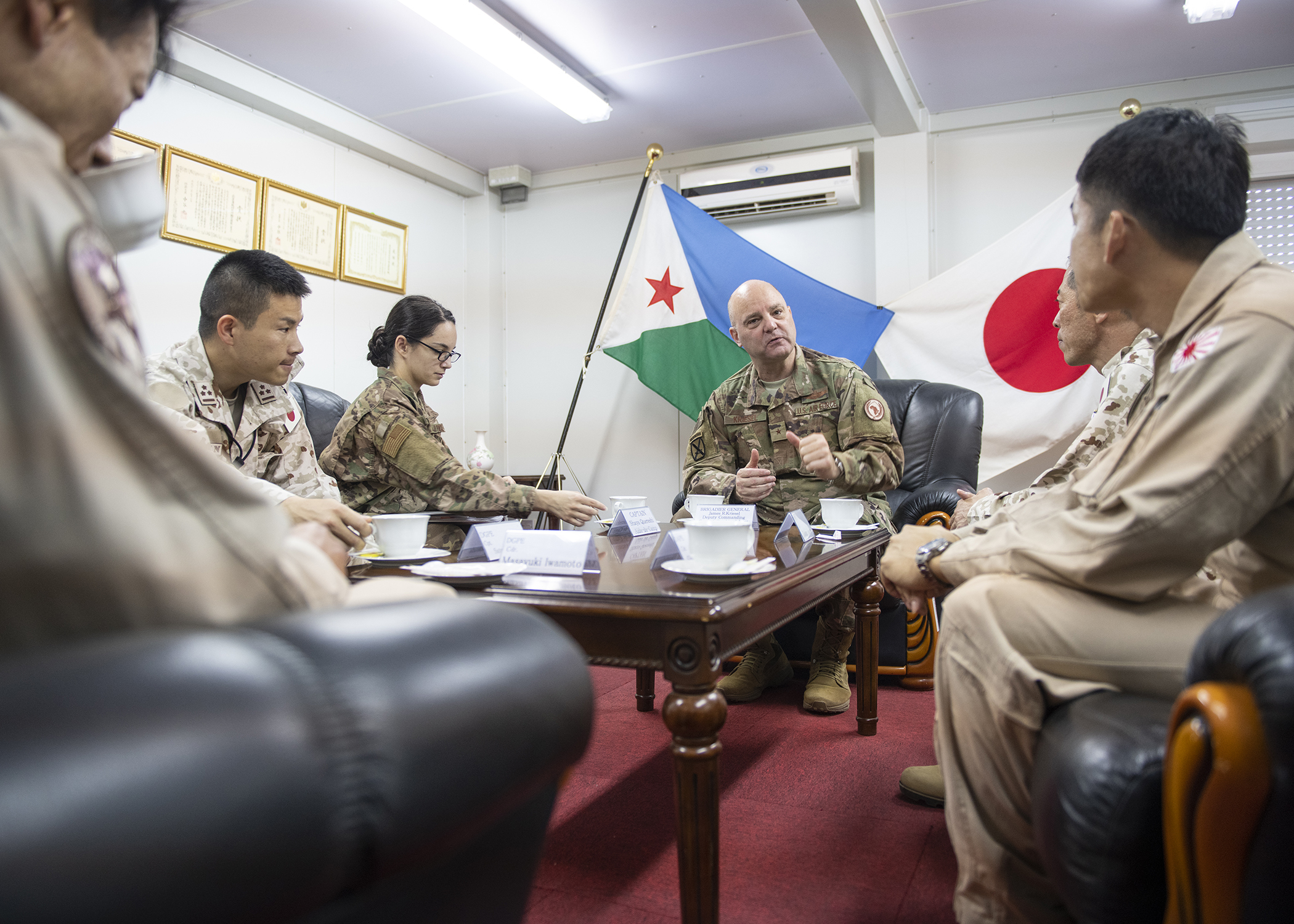 U.S. Air Force Brig. Gen. James R. Kriesel, deputy commanding general, Combined Joint Task Force-Horn of Africa (CJTF-HOA), talks with Japanese Maritime Self Defense Force (JMSDF) partners during a familiarization meet and greet March 4, 2019, in Djibouti. The meeting served as an opportunity for CJTF-HOA leadership to gain a better perspective of the JMSDF mission. (U.S. Air Force photo by Tech. Sgt. Shawn Nickel)
