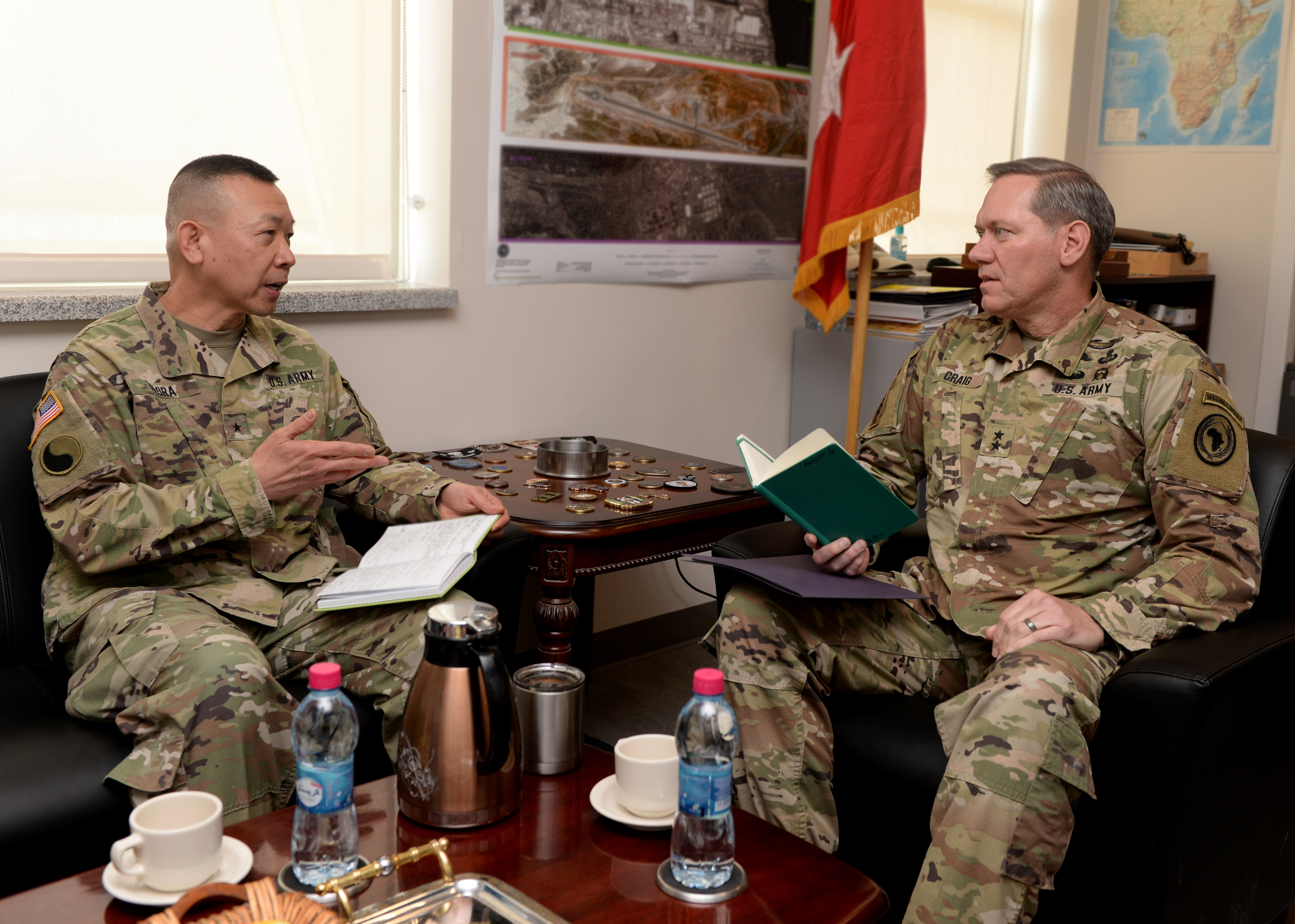 U.S. Army Maj. Gen. James D. Craig, right, commanding general of Combined Joint Task Force-Horn of Africa (CJTF-HOA), speaks with U.S. Army Brig. Gen. Lapthe C. Flora, deputy commanding general of U.S. Army Africa (USARAF), during Flora's visit to Camp Lemonnier, Djibouti, March 5, 2019. Flora visited to familiarize himself with the U.S. Army units embedded in CJTF-HOA and to help foster a better partnership between USARAF and CJTF-HOA. (U.S. Air Force photo by Staff Sgt. Franklin R. Ramos)