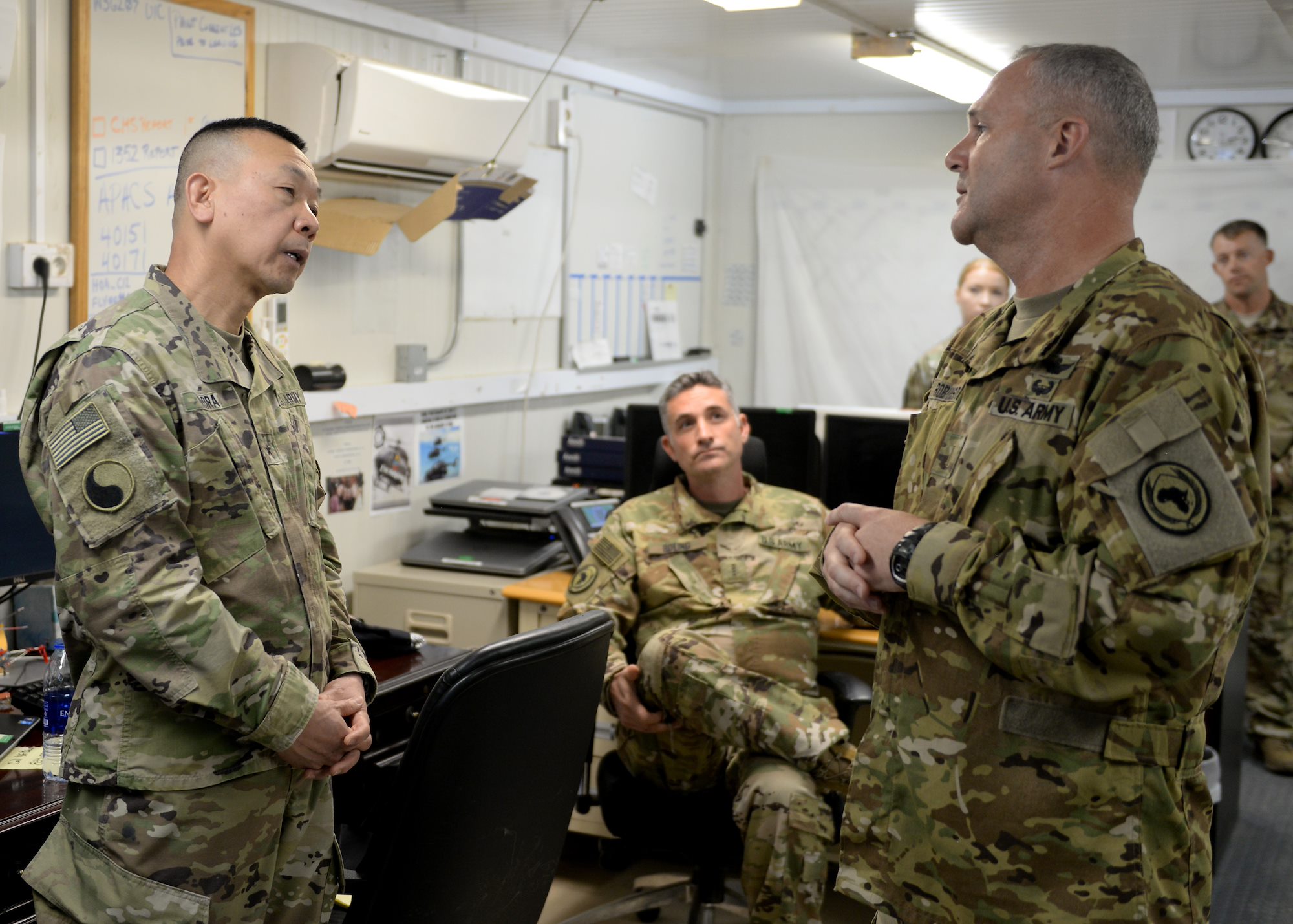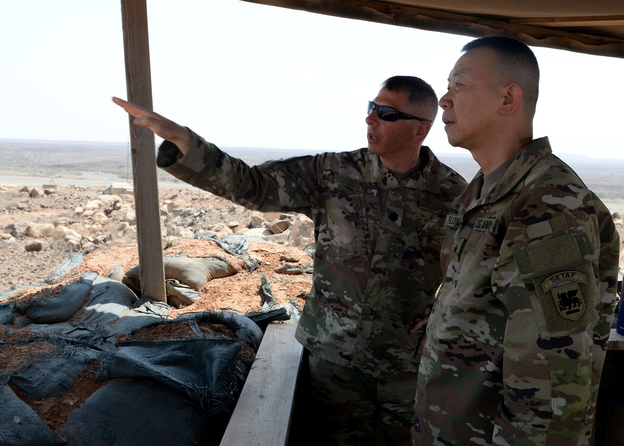 U.S. Army Brig. Gen. Lapthe C. Flora, right, deputy commanding general of U.S. Army Africa (USARAF), listens to U.S. Air Force Lt. Col. Michael Ziska, director of operations for the 870th Air Expeditionary Squadron, supporting Combined Joint Task Force-Horn of Africa (CJTF-HOA), during Flora's visit to a forward operation location in East Africa, March 7, 2019. Flora visited to familiarize himself with the U.S. Army units embedded in CJTF-HOA and to help foster a better partnership between USARAF and CJTF-HOA. (U.S. Air Force photo by Staff Sgt. Franklin R. Ramos)