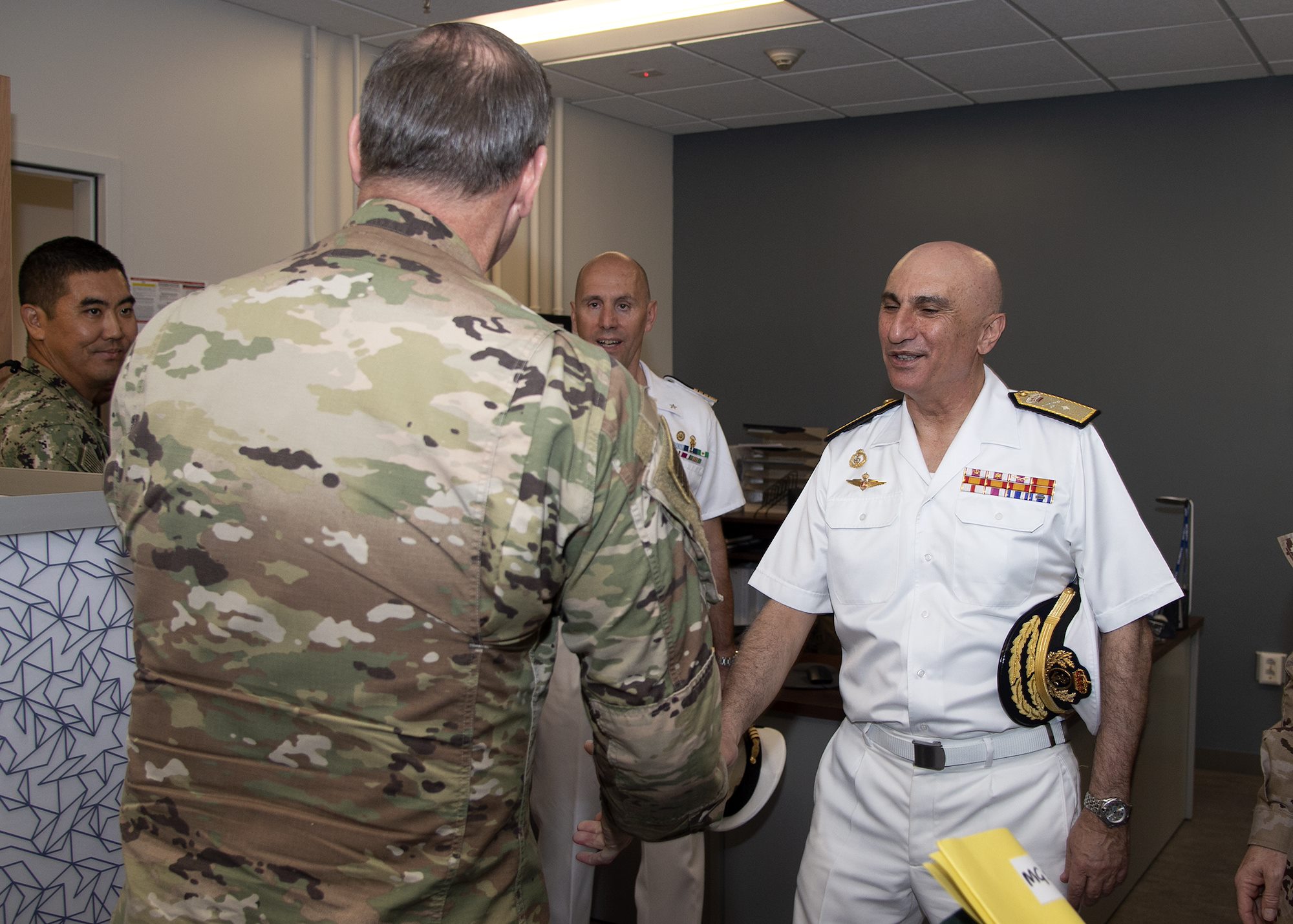 U.S. Army Maj. Gen. James D. Craig, left, commanding general, Combined Joint Task Force-Horn of Africa (CJTF-HOA), shakes hands with Spanish Navy Rear Adm. Ricardo A. Hernández, force commander, European Union Naval Force ATALANTA, at Camp Lemonnier, Djibouti, March 8, 2019. Hernández visited CJTF-HOA during a theater turnover with European Union partners. (U.S. Navy photo by Mass Communication Specialist 1st Class Nick Scott)