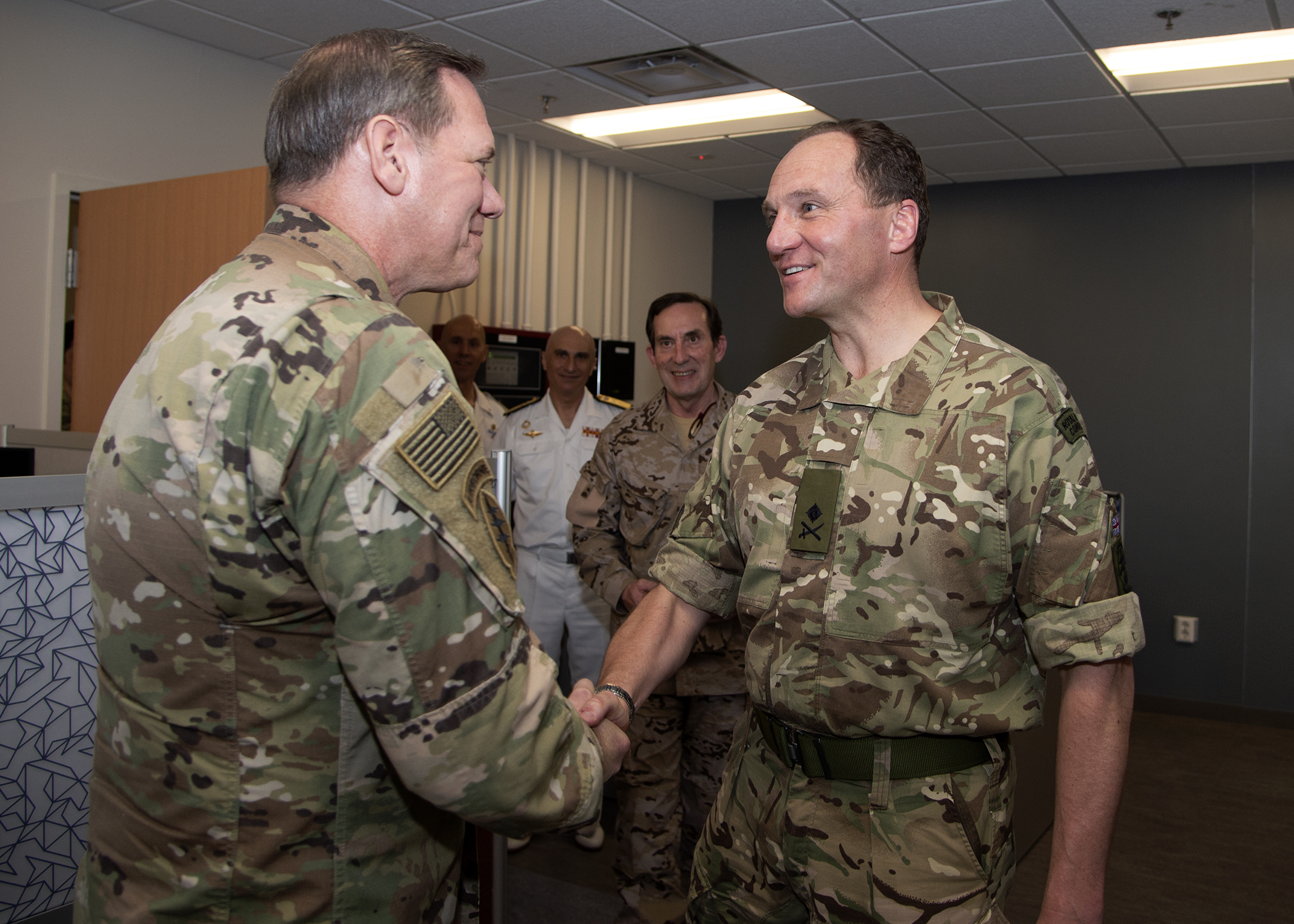 U.S. Army Maj. Gen. James D. Craig, left, commanding general, Combined Joint Task Force-Horn of Africa (CJTF-HOA), shakes hands with Royal Marines Maj. Gen. Charlie Strickland, outgoing operation commander, European Union Naval Force ATALANTA, at Camp Lemonnier, Djibouti, March 8, 2019. Strickland visited CJTF-HOA during a theater turnover with European Union partners. (U.S. Navy photo by Mass Communication Specialist 1st Class Nick Scott)