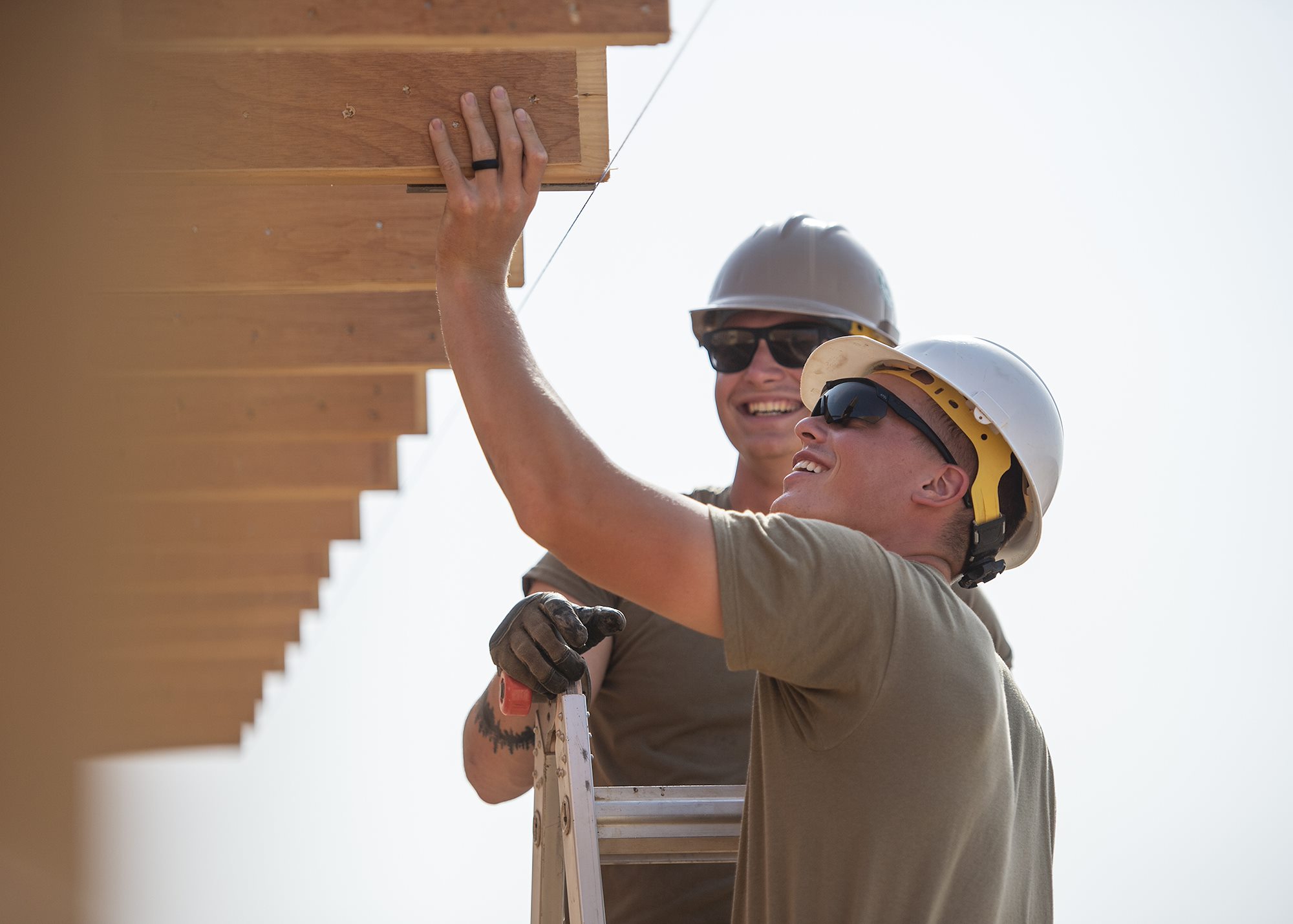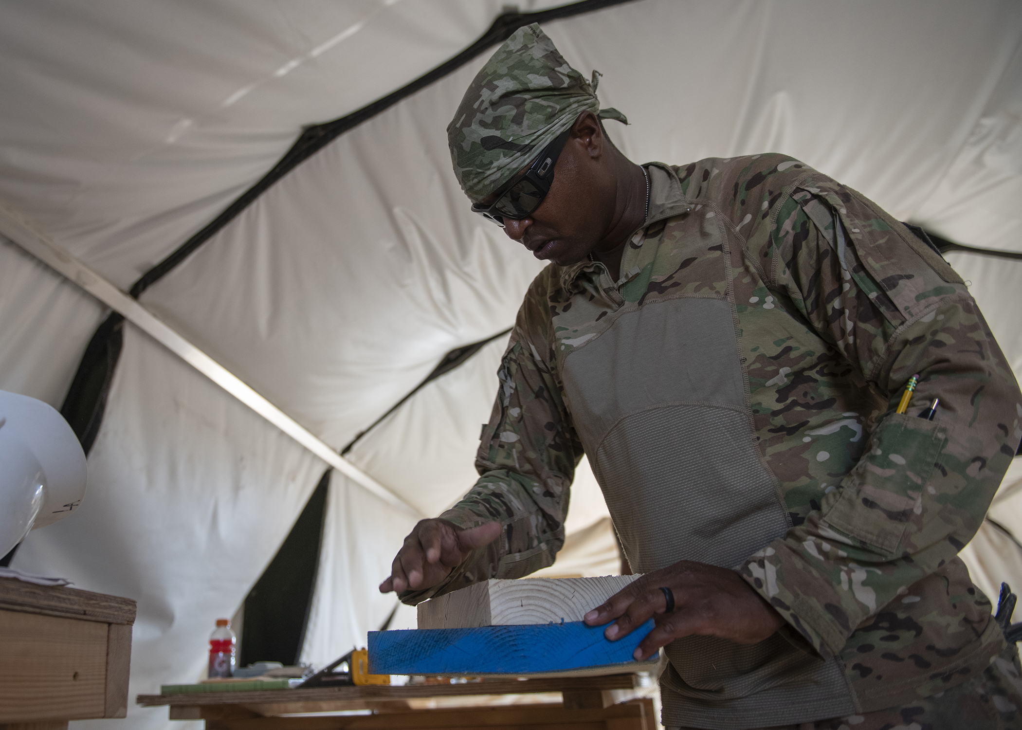 U.S. Army Soldiers from First Platoon, 465th Engineer Company, 926th Engineer Battalion, 926th Engineer Brigade, 412th Theater Engineer Command, based in Birmingham, Alabama, assigned to Combined Joint Task Force-Horn of Africa, cuts trusses to even lengths while building lodging at a forward operating location in East Africa, March 8, 2019. The lodging will replace temporary tents and accommodate U.S. Air Force and U.S. Army personnel at the location. (U.S. Air Force photo by Tech. Sgt. Shawn Nickel)