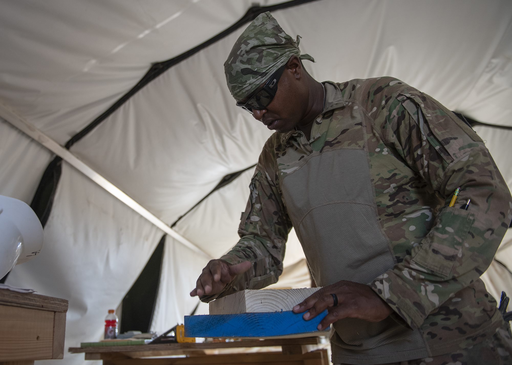 U.S. Army Sgt. Hishmael Ladoueceur, a carpenter from First Platoon, 465th Engineer Company, 926th Engineer Battalion, 926th Engineer Brigade, 412th Theater Engineer Command, based in Birmingham, Alabama, assigned to Combined Joint Task Force-Horn of Africa, cuts lumber for stairs while building lodging at a forward operating location in East Africa, March 8, 2019. The lodging will replace temporary tents and accommodate U.S. Air Force and U.S. Army personnel at the location. (U.S. Air Force photo by Tech. Sgt. Shawn Nickel)