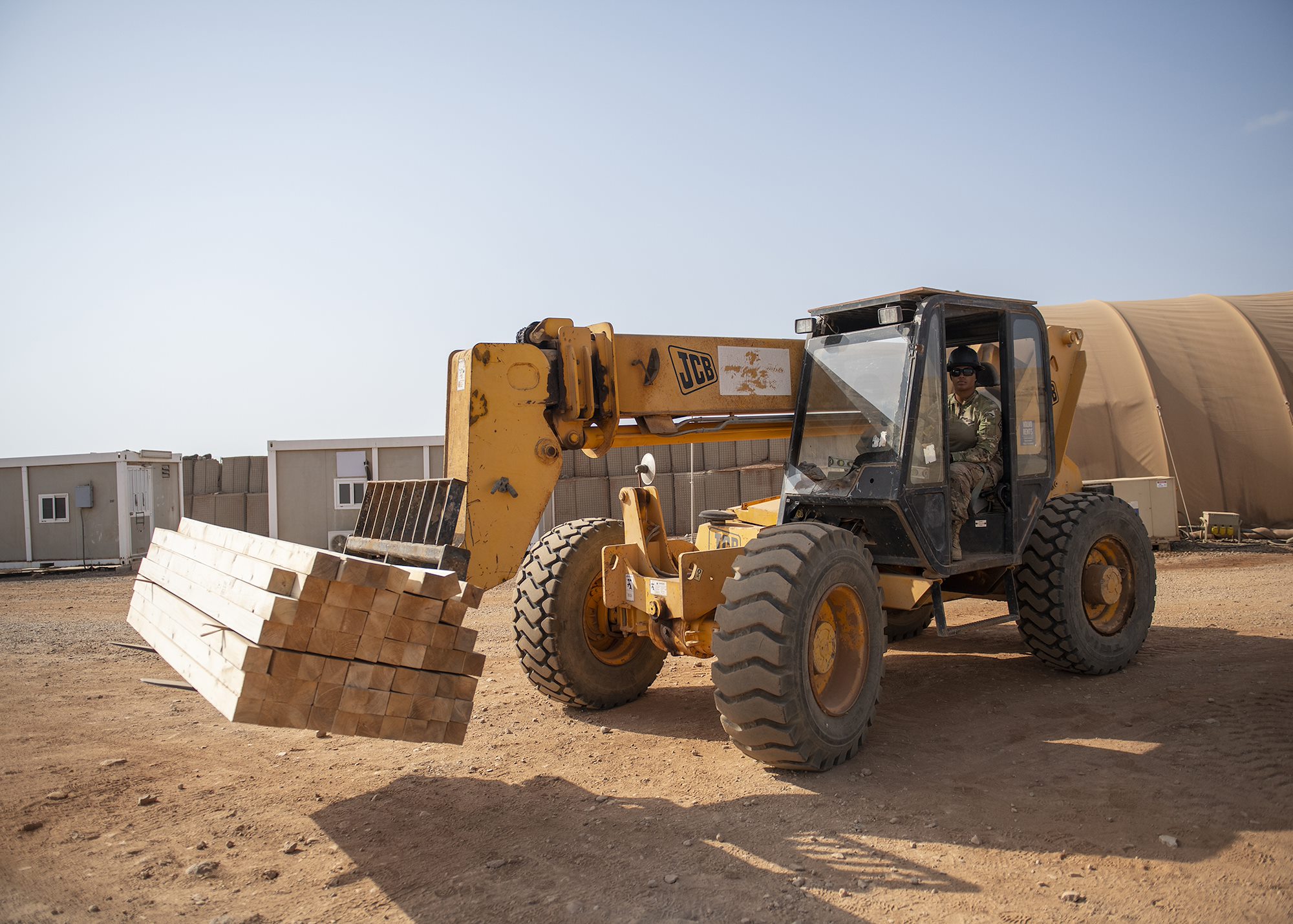 U.S. Army Spc. Joyce Blanco-Peredes, a heavy equipment operator from First Platoon, 465th Engineer Company, 926th Engineer Battalion, 926th Engineer Brigade, 412th Theater Engineer Command, based in Birmingham, Alabama, assigned to Combined Joint Task Force-Horn of Africa, moves lumber while building lodging at a forward operating location in East Africa, March 8, 2019. The lodging will replace temporary tents and accommodate U.S. Air Force and U.S. Army personnel at the location. (U.S. Air Force photo by Tech. Sgt. Shawn Nickel)