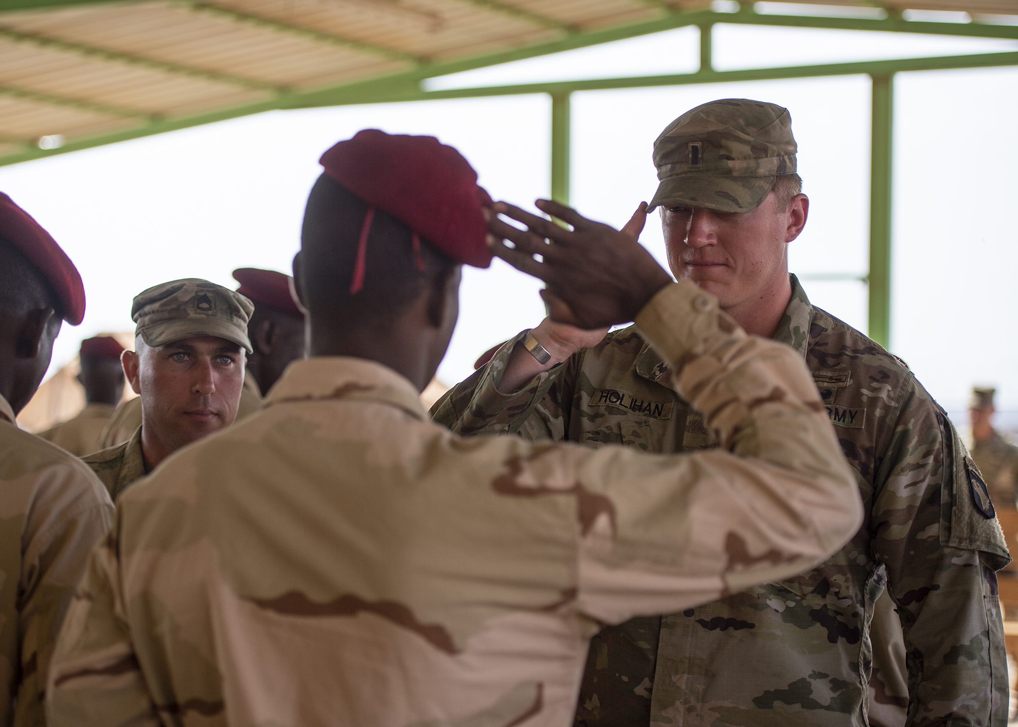 U.S. Army 1st Lt. Travis Holihan, the officer in charge of NCO training, Headquarters Company, 1-26 Infantry Battalion, 2nd Brigade Combat Team, 101st Airborne, assigned to Combined Joint Task Force-Horn of Africa, returns a salute during an NCO course graduation for the Rapid Intervention Battalion (RIB), a Djiboutian army elite military force, at a training location near Djibouti, March 7, 2019. U.S. Soldiers with Holihan’s unit taught the course to the RIB soldiers. (U.S. Air Force photo by Tech. Sgt. Shawn Nickel)