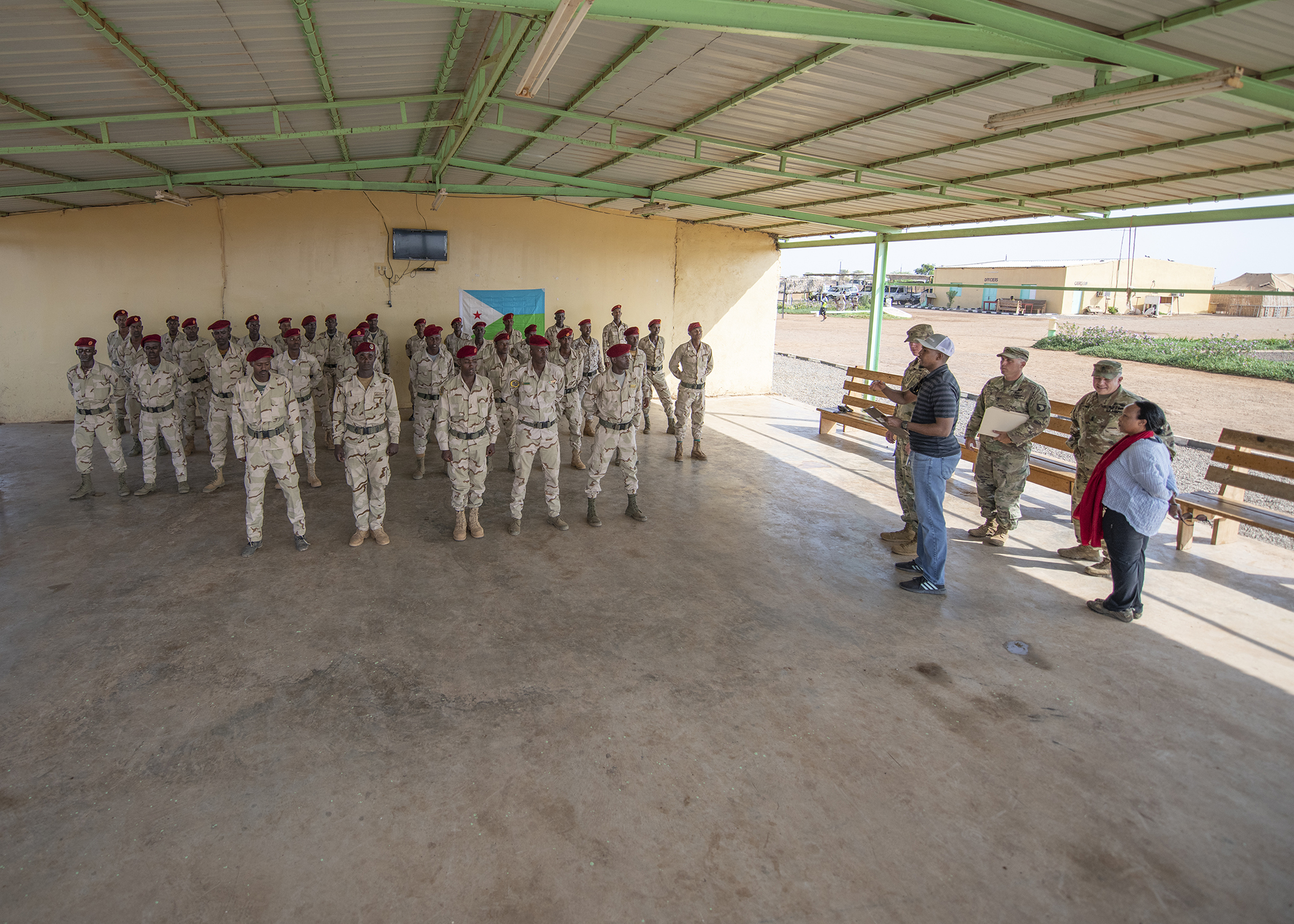 Rapid Intervention Battalion (RIB) soldiers from the Djiboutian army’s elite military force stand in formation during an NCO course graduation at a training location near Djibouti, March 7, 2019. U.S. Soldiers with 1-26 Infantry Battalion, 2nd Brigade Combat Team, 101st Airborne, assigned to Combined Joint Task Force-Horn of Africa, taught the course to the RIB soldiers. (U.S. Air Force photo by Tech. Sgt. Shawn Nickel)