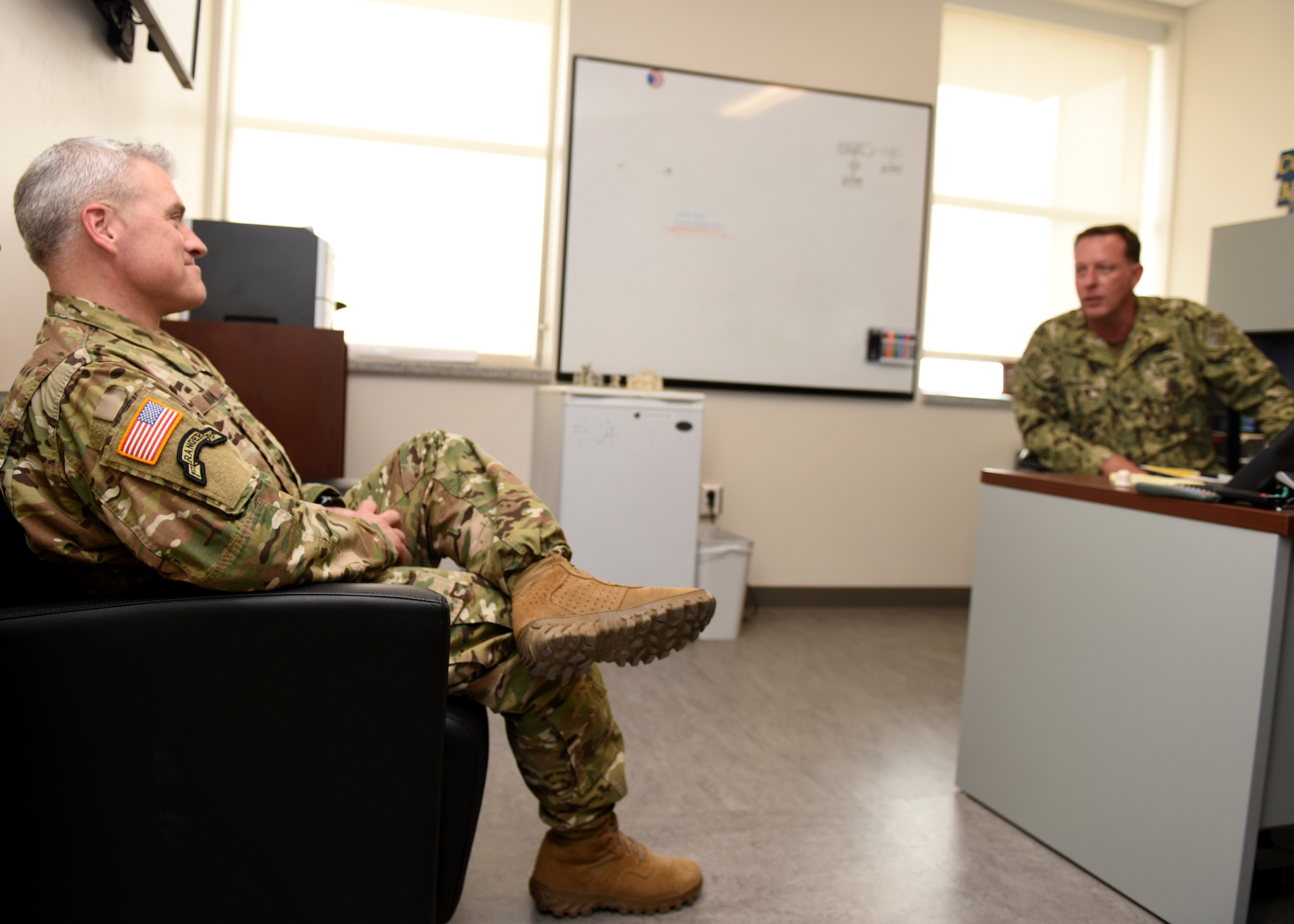 U.S. Army Command Sgt. Maj. Jeremiah E. Inman, left, command sergeant major of U.S. Army Africa (USARAF), meets with U.S. Navy Master Chief Petty Officer Karl W. Parsons, command senior enlisted leader of Combined Joint Task Force-Horn of Africa (CJTF-HOA), during Inman's visit to Camp Lemonnier, Djibouti, March 11, 2019. Inman visited to familiarize himself with the U.S. Army units embedded in CJTF-HOA and to help foster a better partnership between USARAF and CJTF-HOA. (U.S. Air Force photo by Staff Sgt. Franklin R. Ramos)